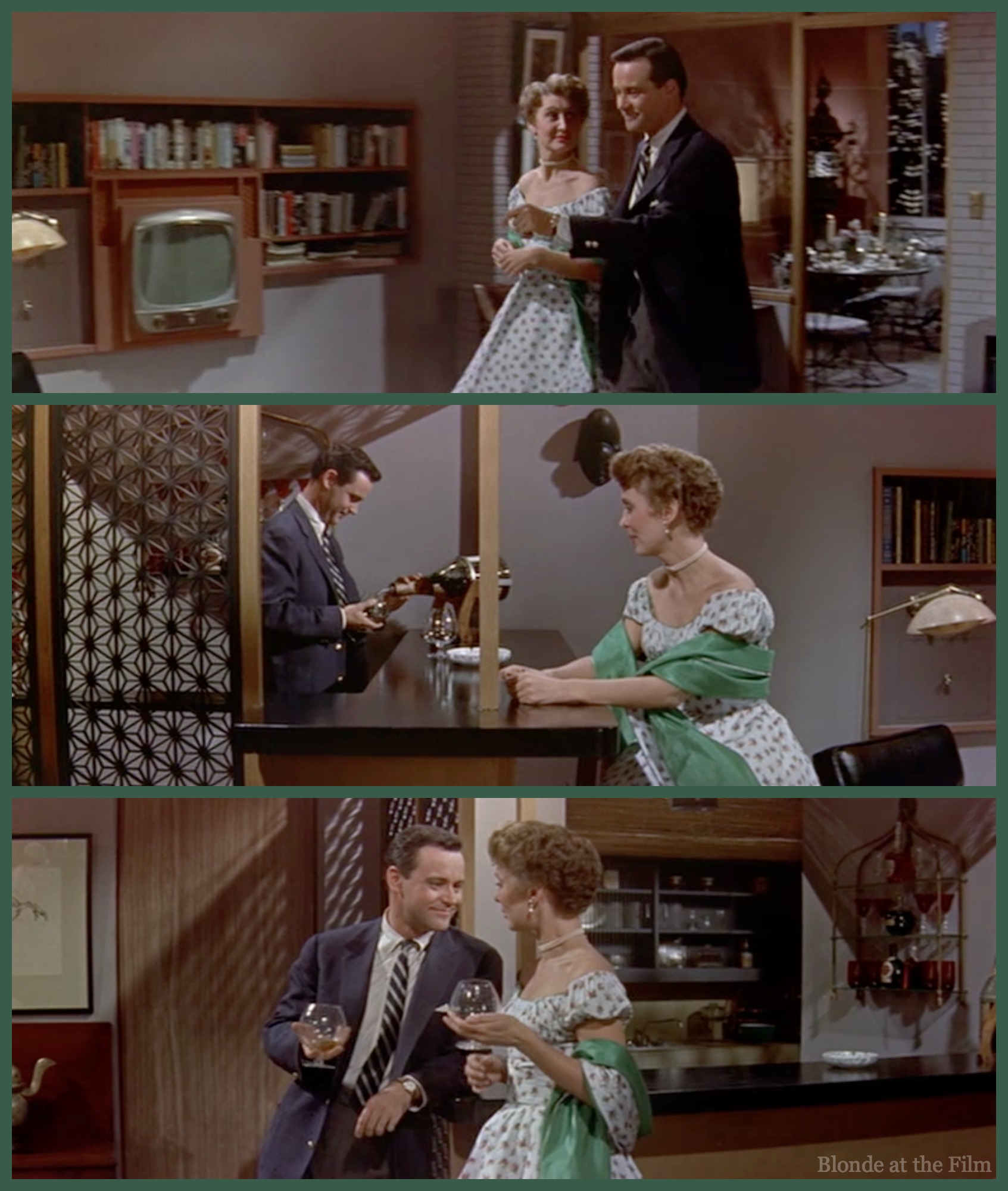 They have  a lovely time in Bob’s mid-century modern apartment. Notice the brandy dispenser in the middle image!  It’s terribly convenient–just tip and pour!