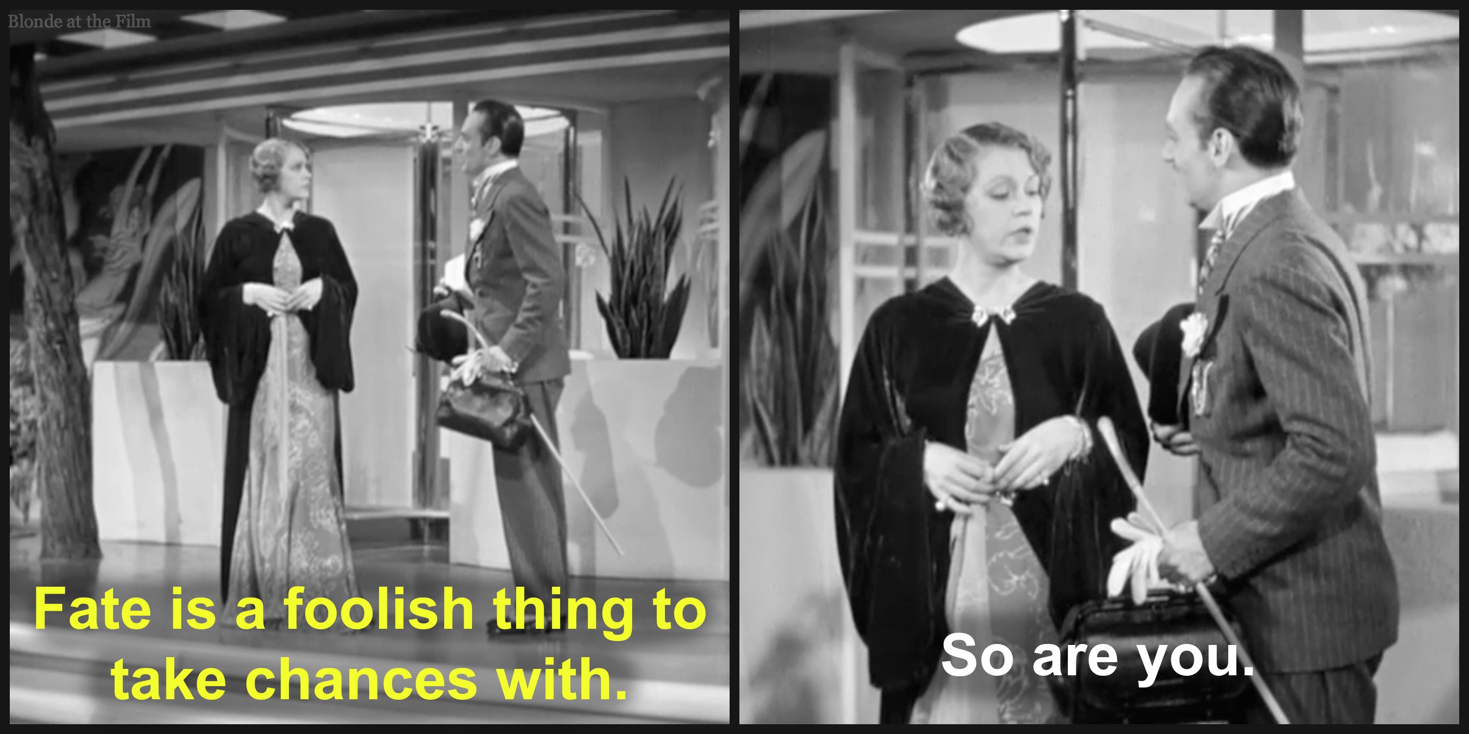 After the music ends, Mimi rises from that lovely dip in a daze. This obnoxious man suddenly seems pretty wonderful! Until he says, “Chance is the fool’s name for fate” as he tells her how amazing it is that they are both at the same hotel. She snaps back to reality, horrified that this man whom she is falling in love with is the co-respondent hired to fake an affair! Horrors!