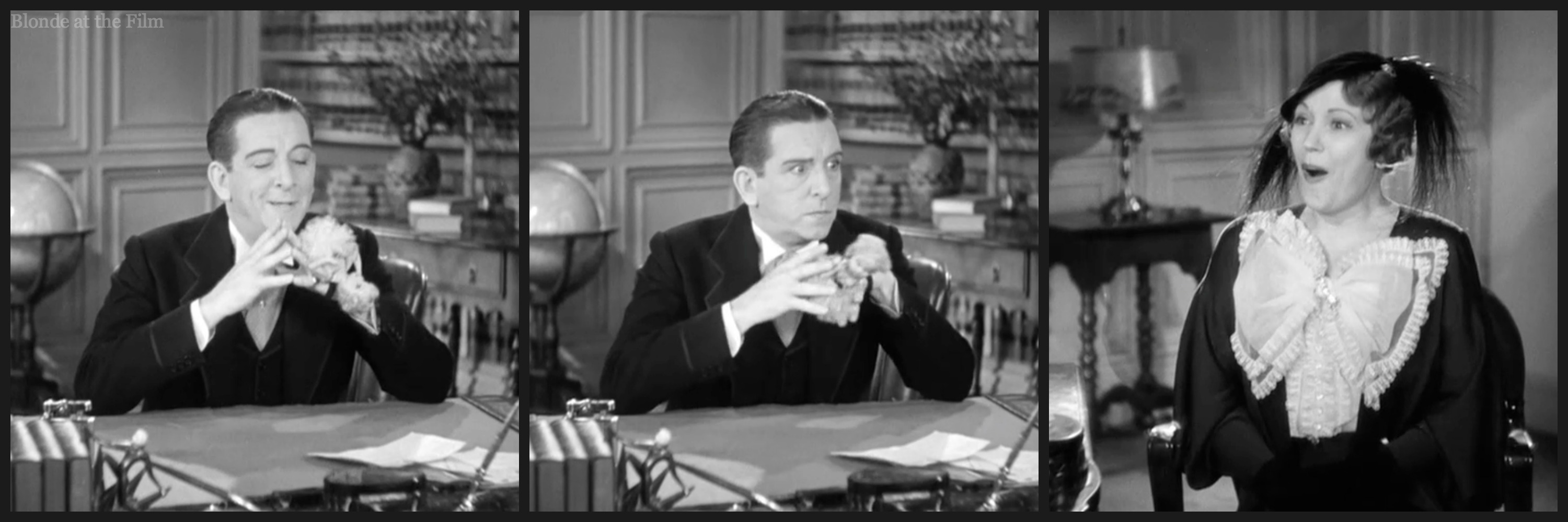 While Hortense and Mimi wait, Egbert is in his office playing with his finger puppet. (They had to bring those things back!) He is startled when his secretary comes in to announce his visitors. Edward Everett Horton has the greatest reactions and double takes!