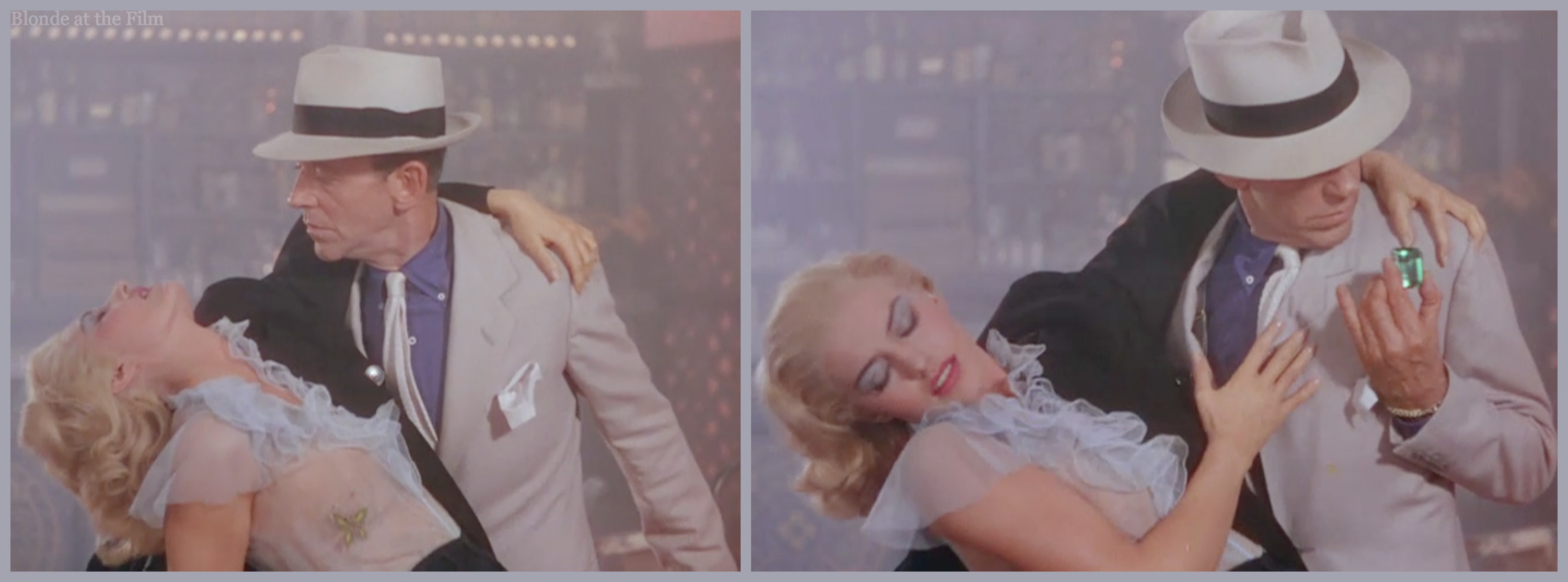 Riley is minding his own business on the deserted street, noting that “The rats and hoods and killers were in their holes”). Suddenly, a beautiful blonde in a lemony coat dress and matching flats (more lemon!) dances, terrified, towards him. She is running from something, but they have time for a frantic duet.