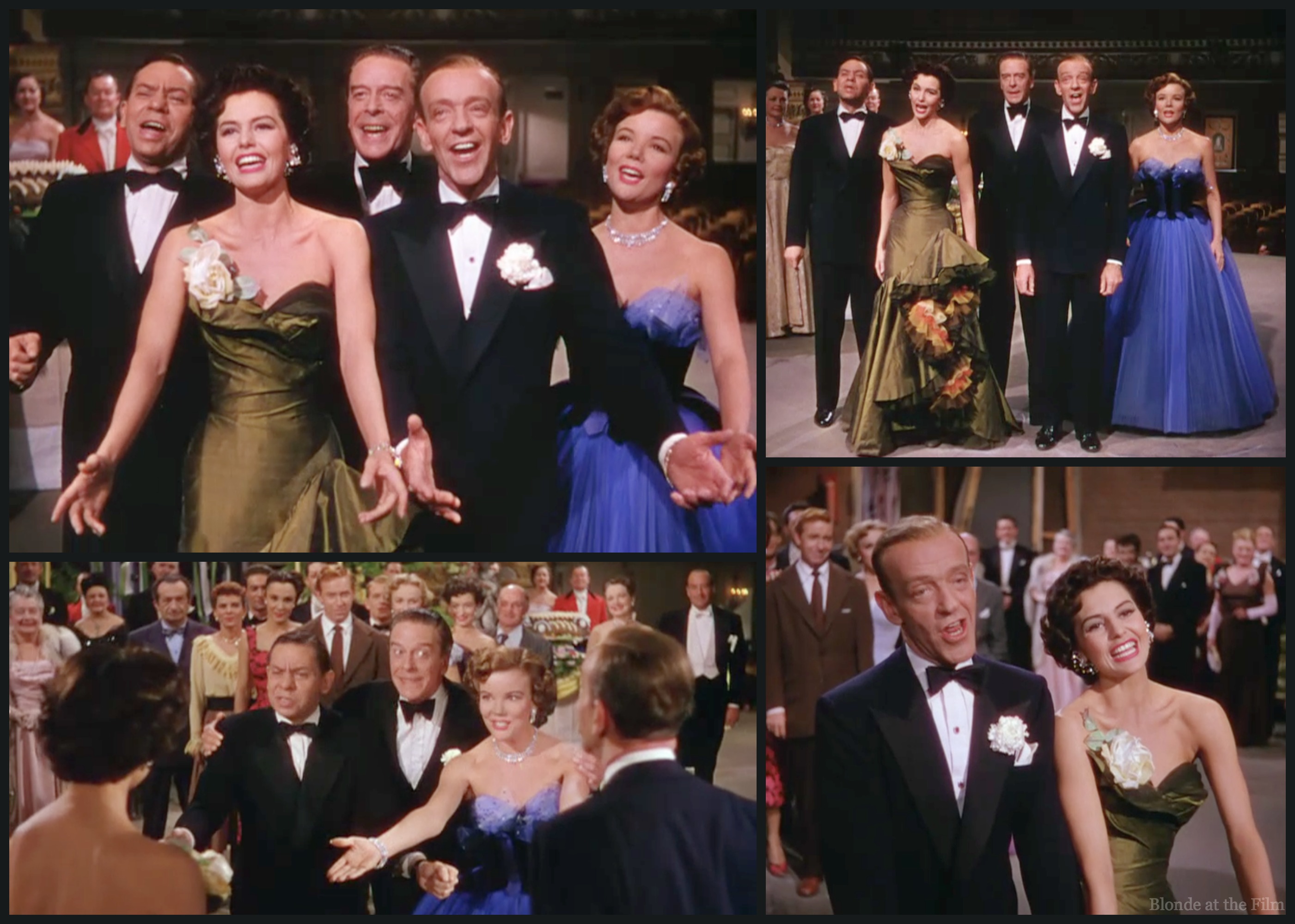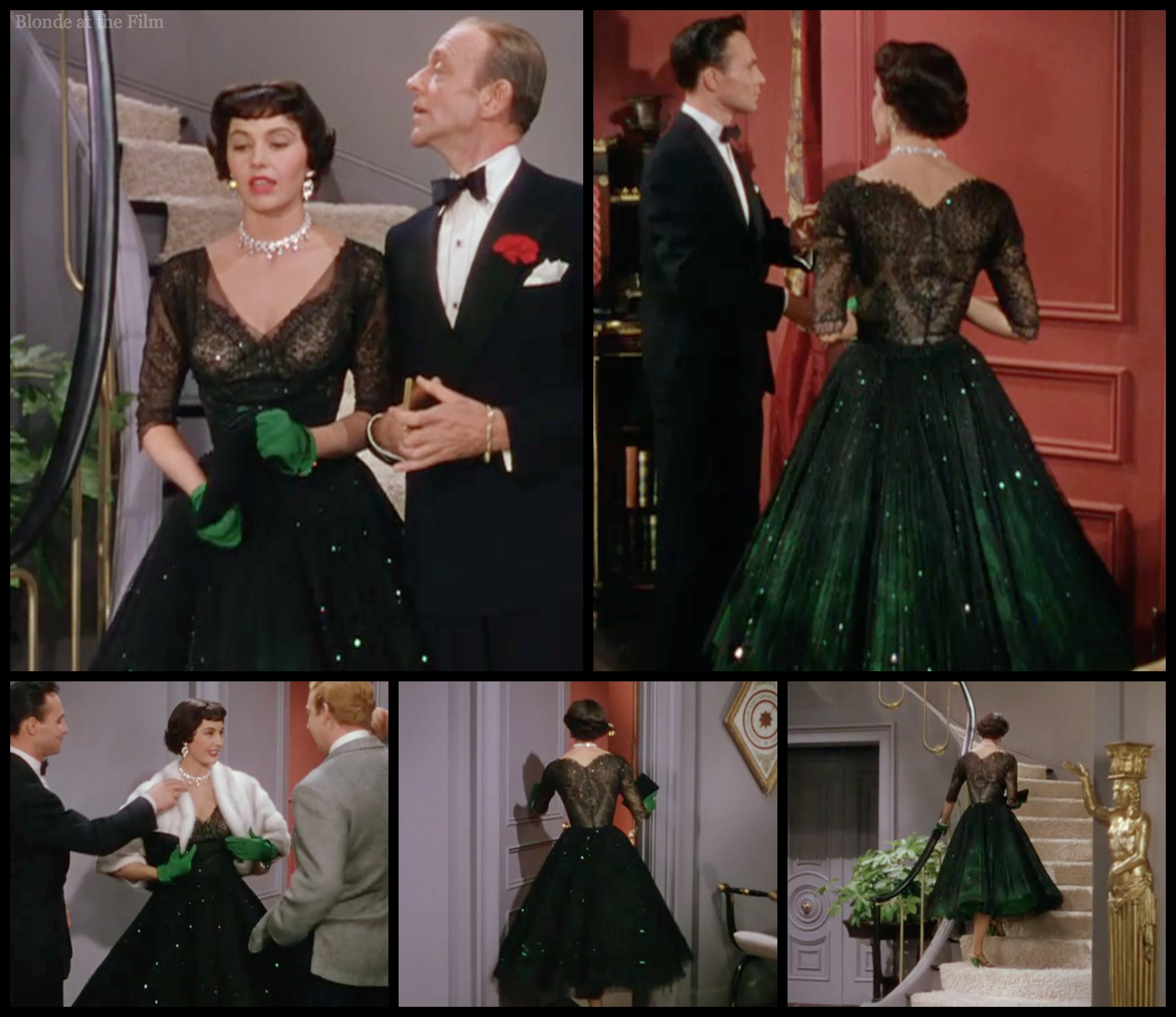 Costume appreciation break: Gabby is resplendent in sparkling black lace with bottle-green gloves, shoes, and underskirt. Look at the scalloped back! And the way the green underskirt pops out in certain lighting! Splendid! Costume designer Mary Ann Nyberg does a terrific job, especially with Charisse’ dance costumes in this film.