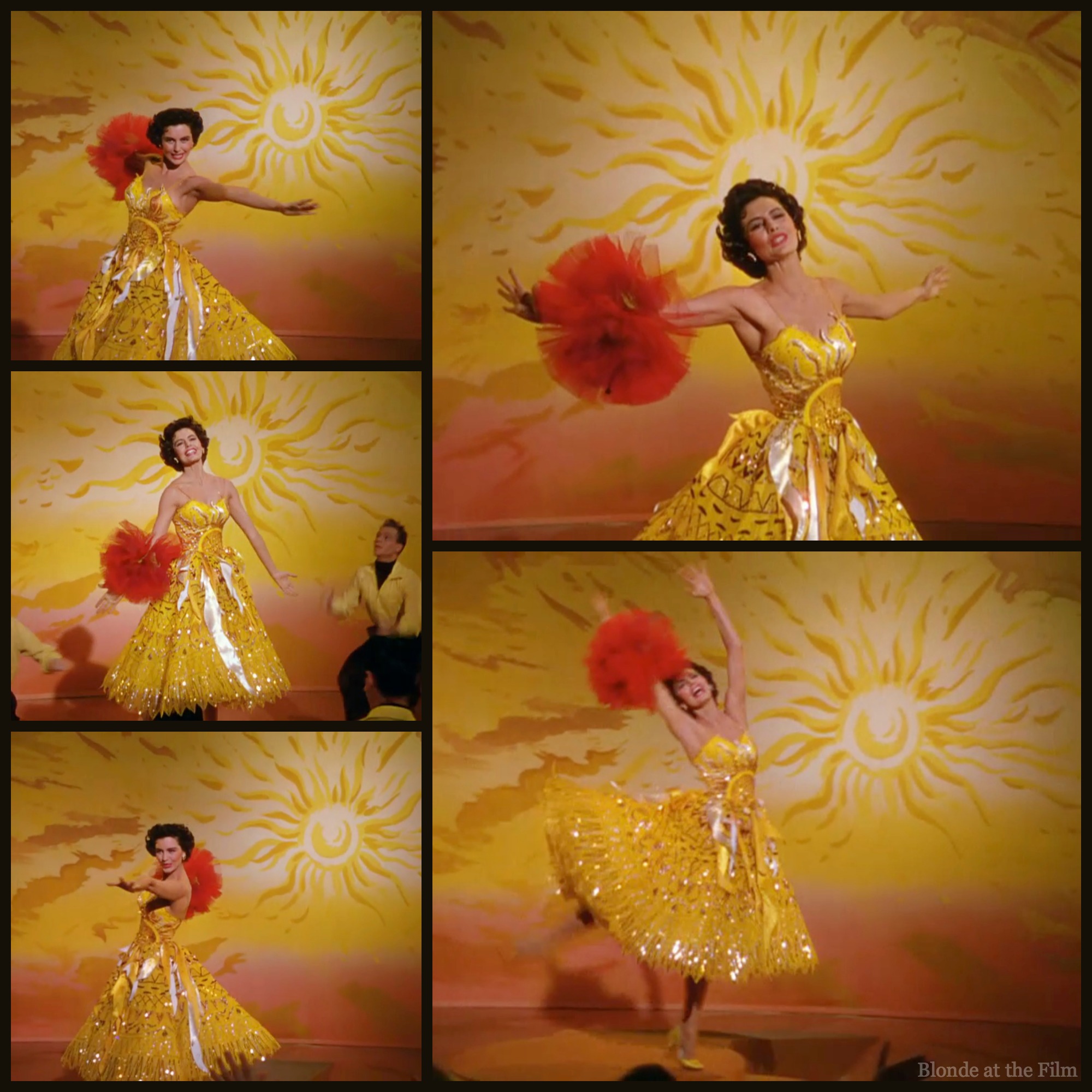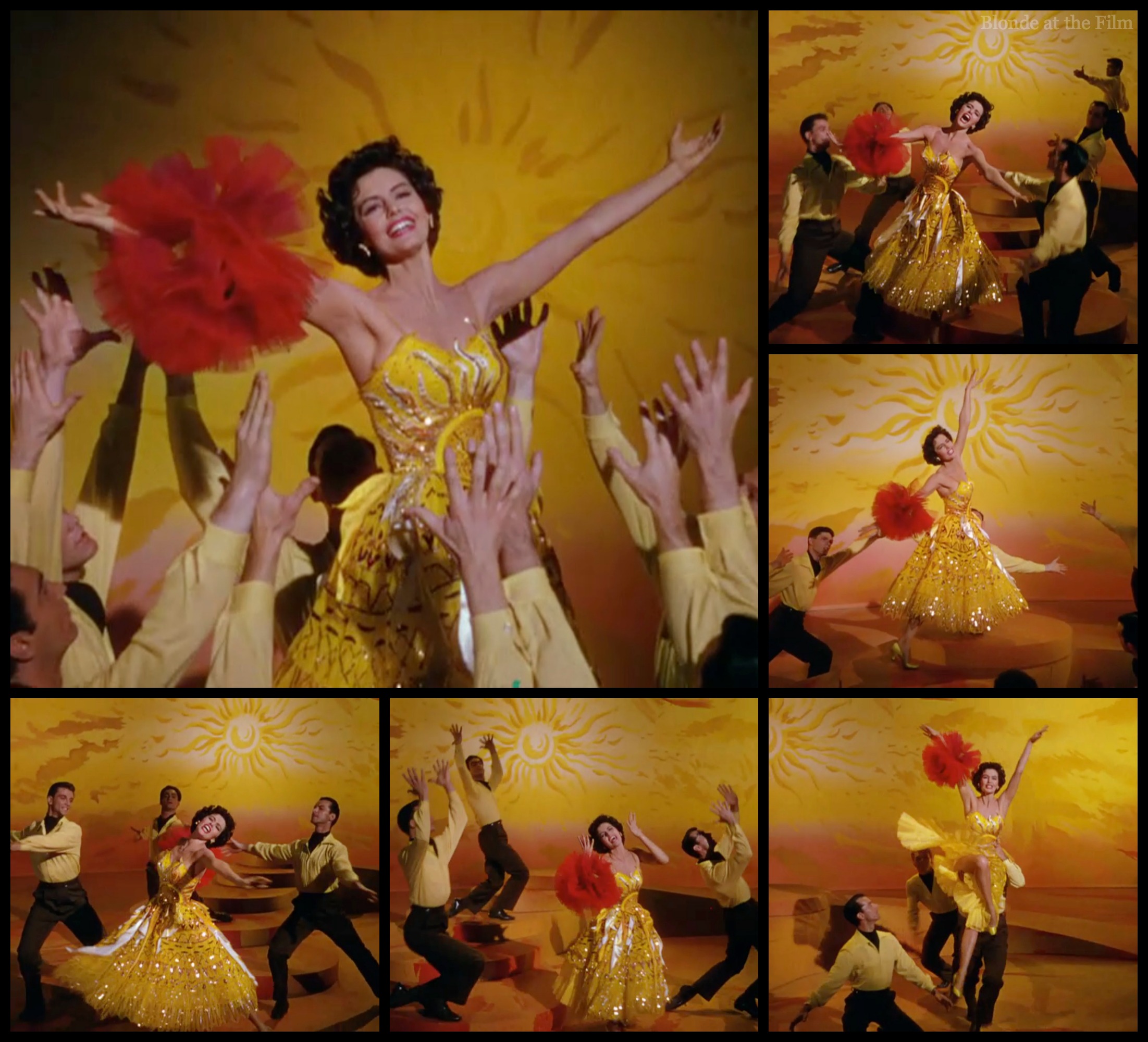 It reminds me of “Get Happy” in Summer Stock (1950) with its flat, stylized-sky backdrop, one solo woman singing an optimistic tune, and a bunch of male dancers. But instead of that classic tux-no-pants and coolly restrained dancing that Garland pulls off so wonderfully, this number has Charisse in the most stunning “sun” dress and red wrist pouf, dancing her heart out!