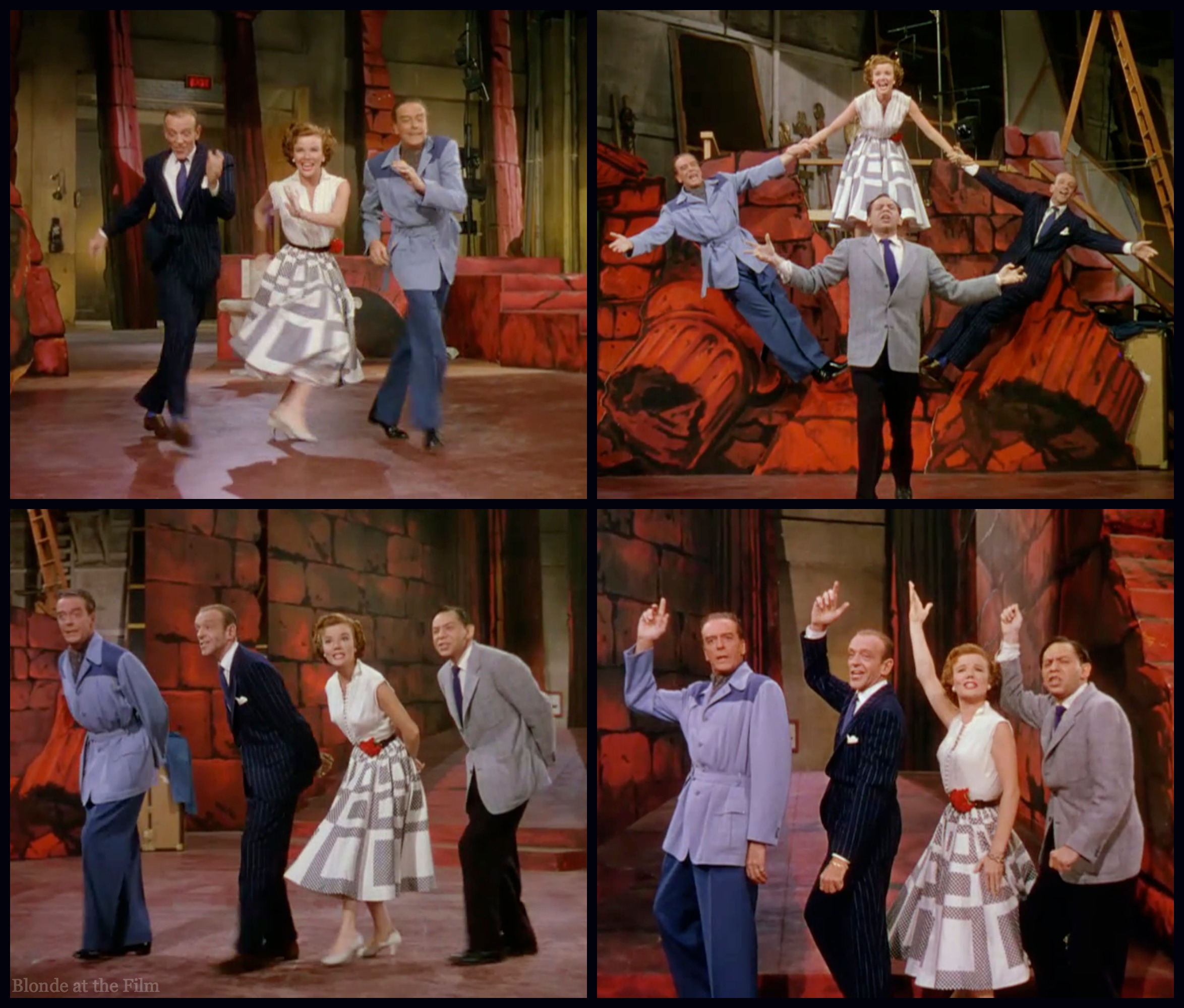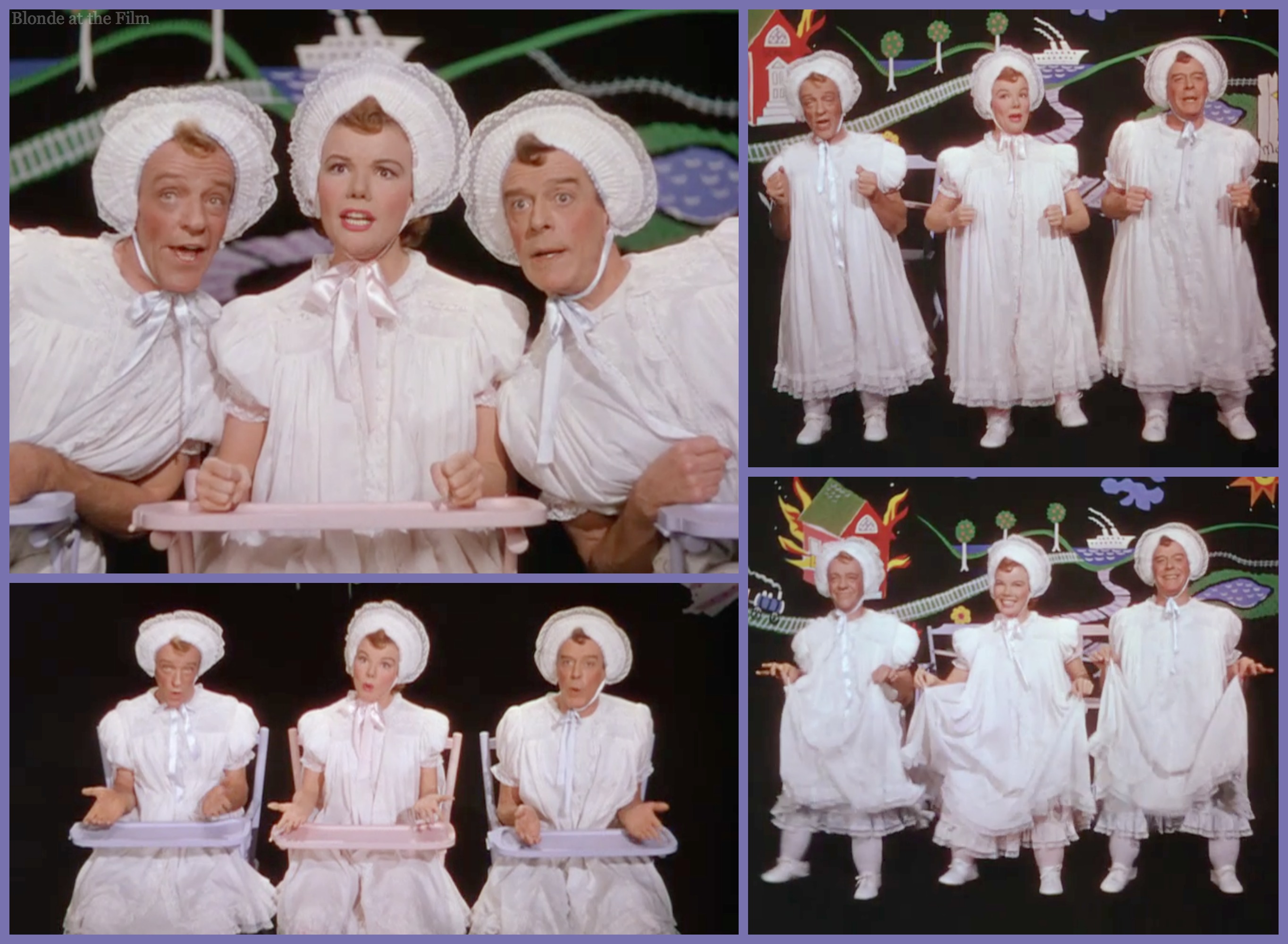 Why was the “Triplets” number so demanding? Well, Michael Kidd decided to choreograph it with his three performers on their knees with black stockings covering their lower legs. Specially made baby shoes were then attached to the front of their knees, and against the set’s black floor, it really looks as though Astaire, Fabray, and Buchanan are triplet toddlers. I like their matching forelock curls.