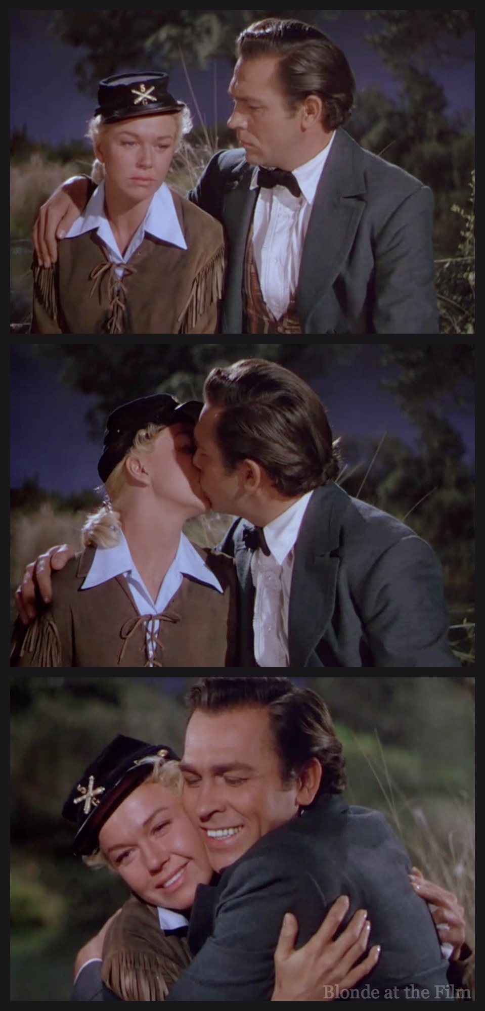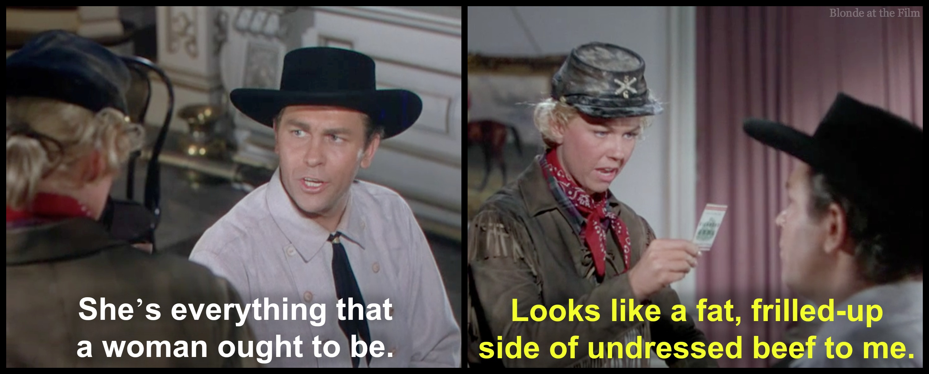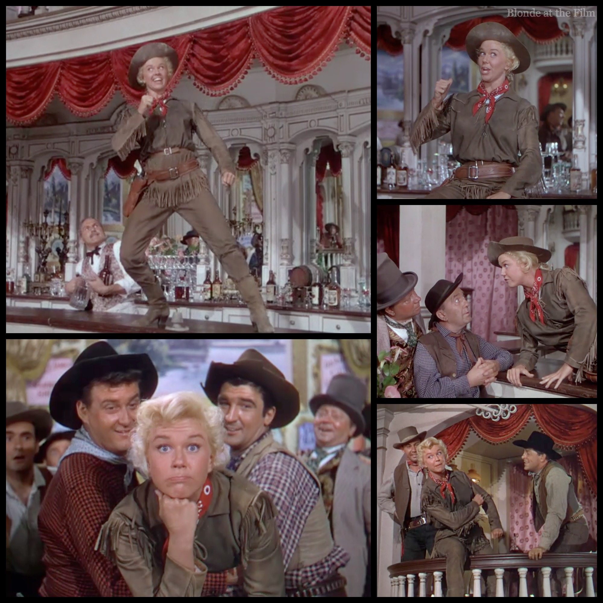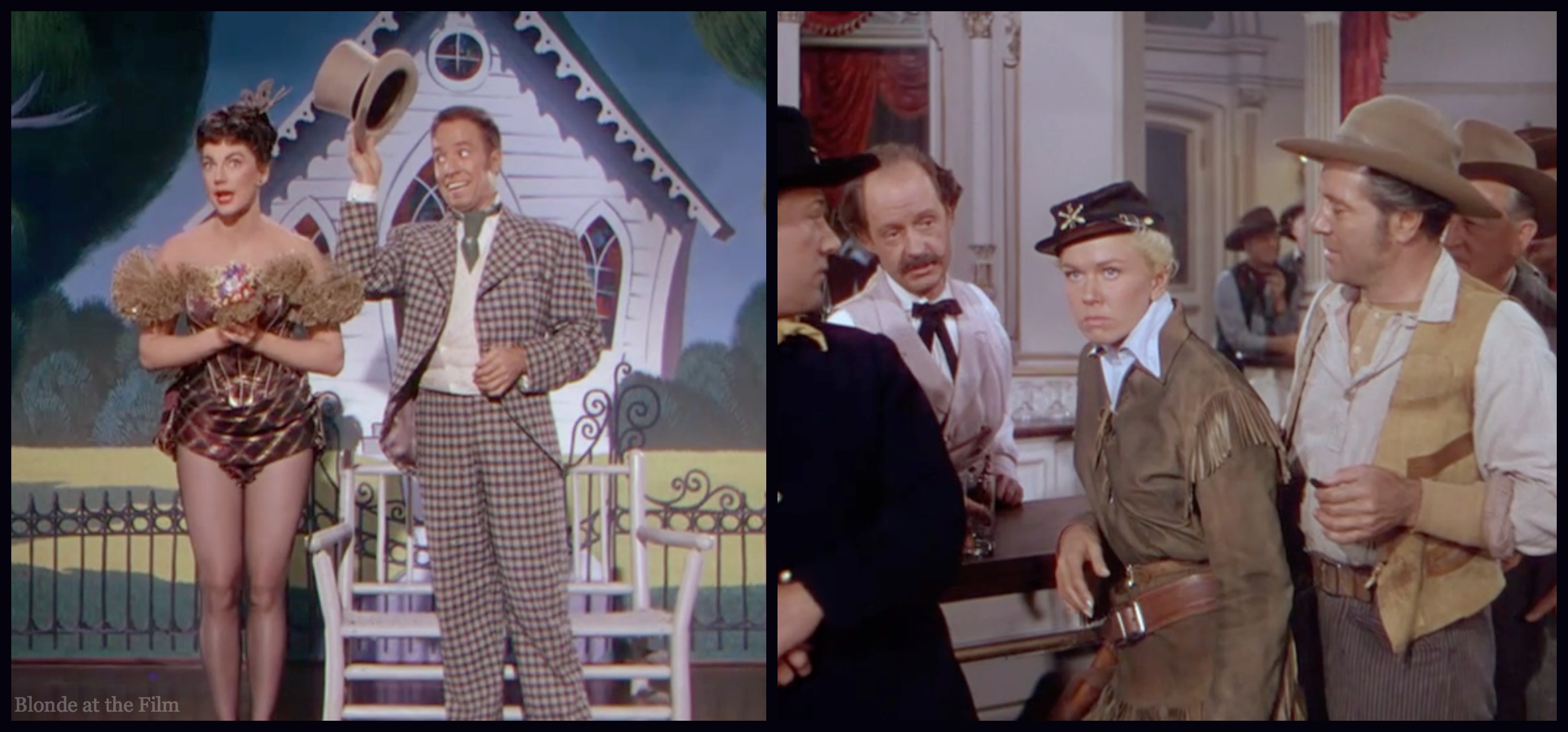I cannot even imagine what their lives will be like after they ride off into the sunset, but who cares? It’s a 1950s movie-musical. Maybe Calamity can keep protecting the stage and be a good little wife to Bill, and maybe Katie can continue fulfilling her dream on the stage and be a good little wife to Danny. Doubtful. I wish that Calamity had fastened her gun belt on over her wedding dress as they rode away, but you can’t have everything. She does try to smuggle her revolver in her bustle, but Bill spots it and hands it off to someone else before they leave. So that’s not great.
