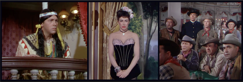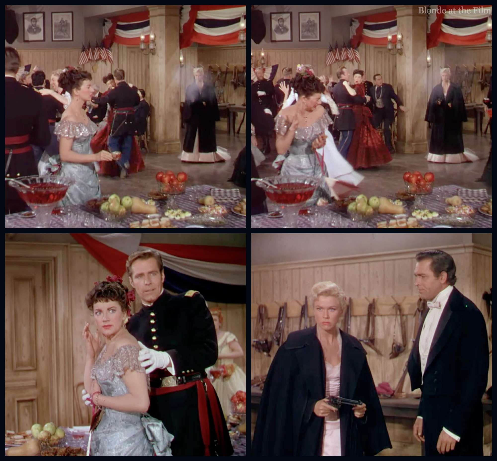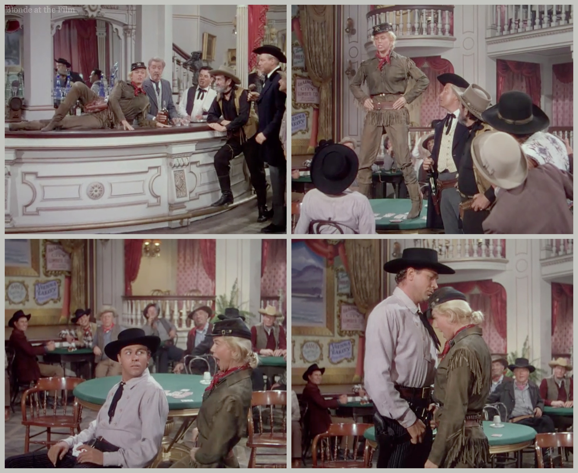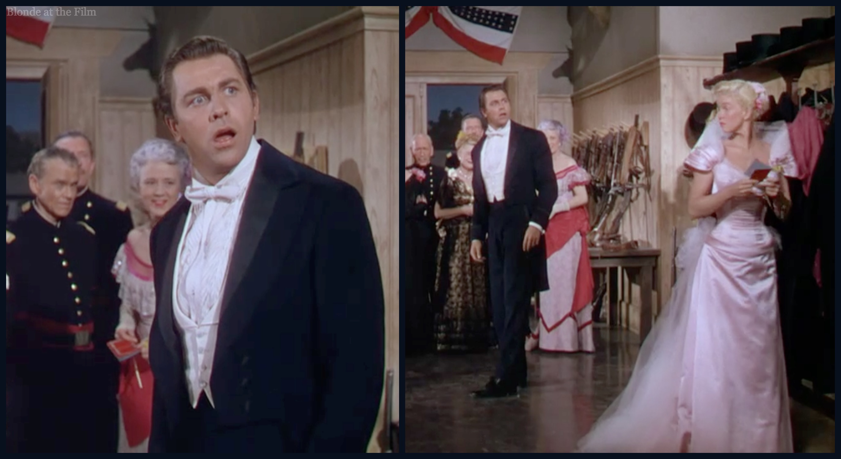 Bill is stunned, and his jaw-dropping reaction is echoed by just about everybody at the ball. They’ve never seen Calamity looking so beautiful and so very feminine! Costume designer Howard Shoup really outdid himself on this candy confection: Calamity as 1880s Barbie!