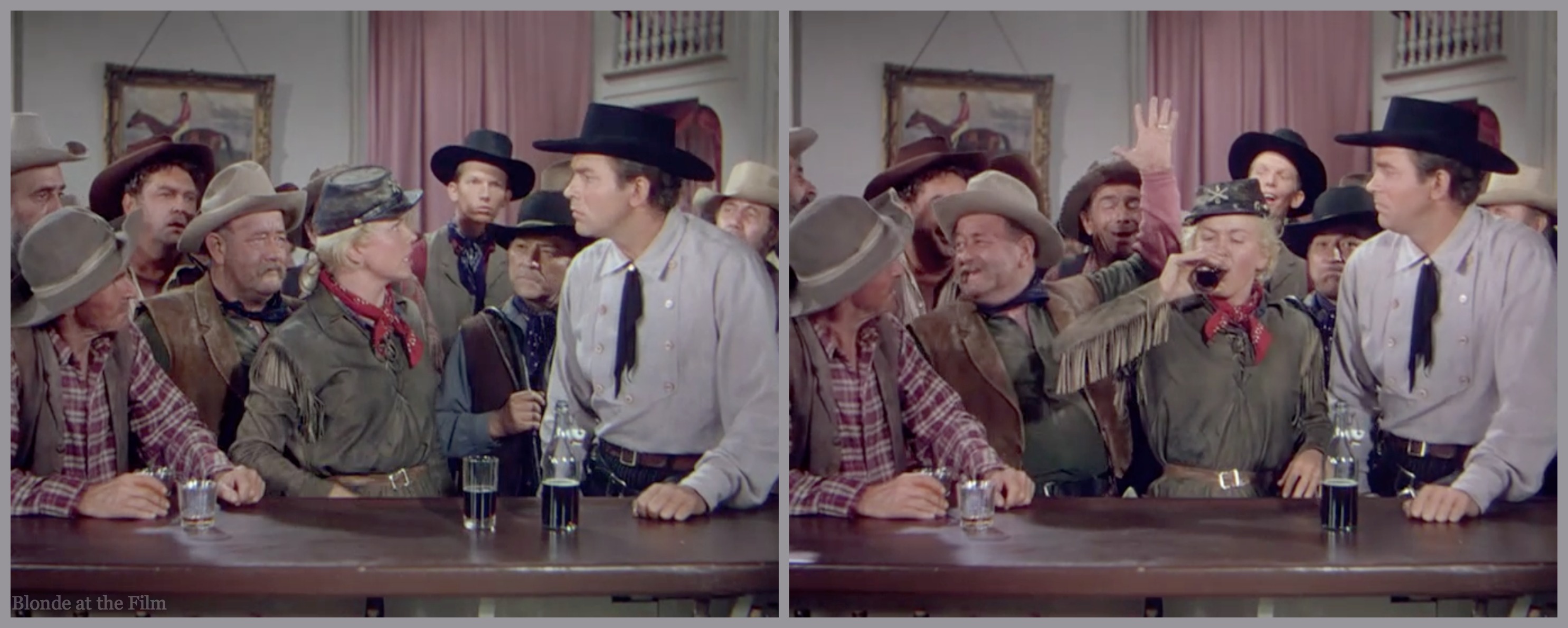 Fun fact: the horse she jumps on isn’t just any horse. It was Joel McCrea‘s Quarter horse Dollar, who McCrea rode in over twenty of his westerns.