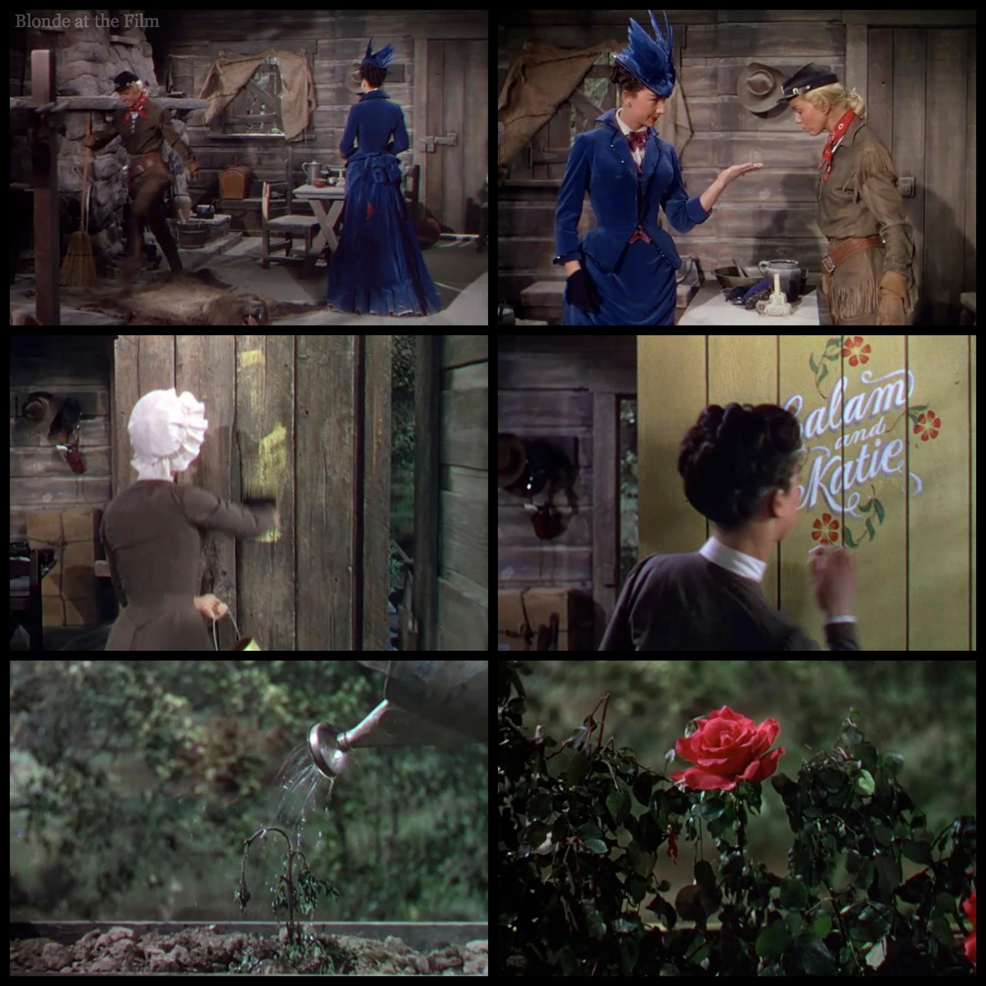 Poor Calamity is rather bewildered, as am I, because it seems as though they did everything in one day, including growing gorgeous roses and completing some major structural repairs. But by the end of the song Calamity is in a pretty dress and the cabin is sparkling! You can watch “A Woman’s Touch” here.