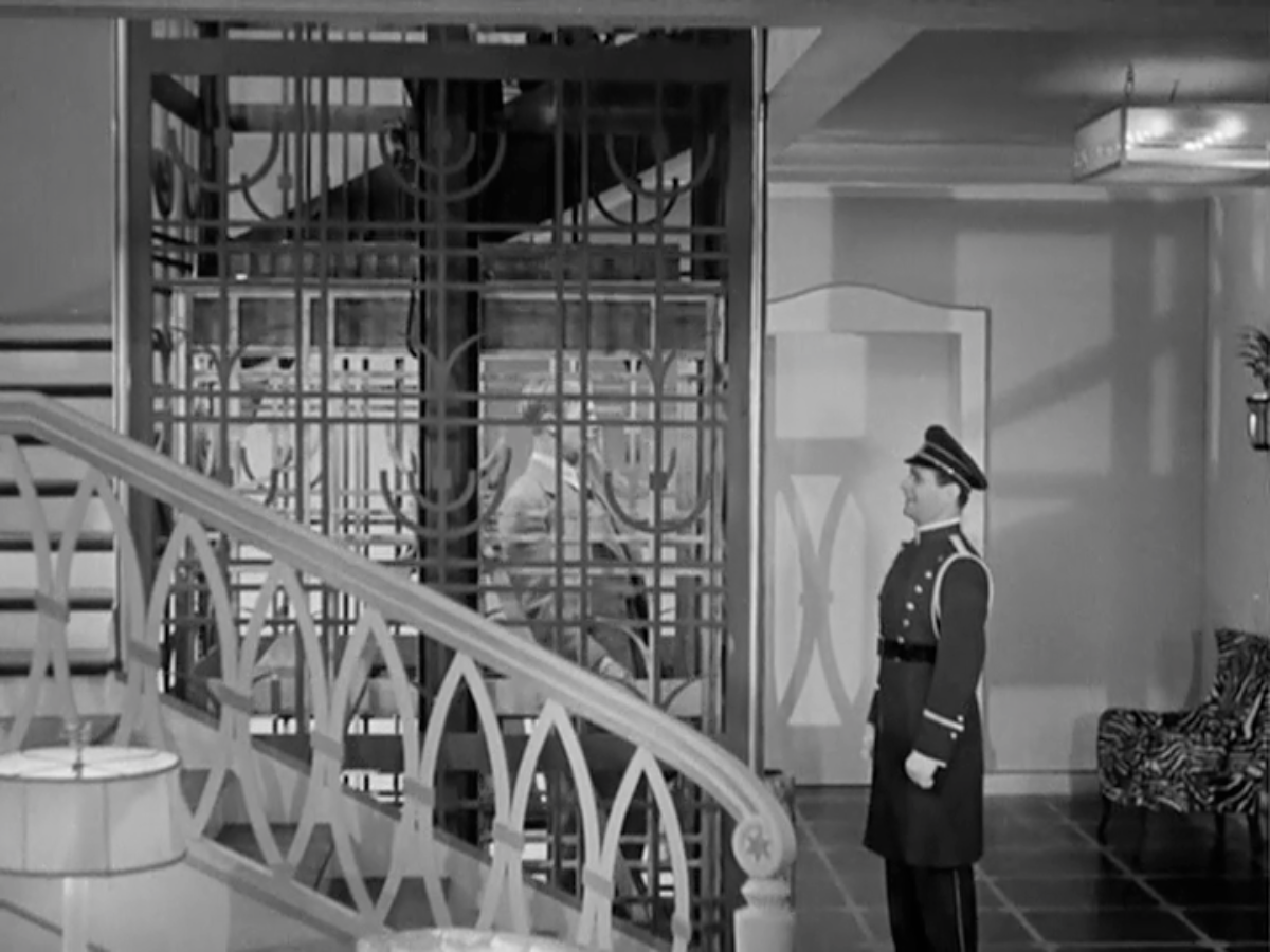 John goes inside and gets stuck in the elevator halfway between the 2nd and third floors. The set is a remarkable three-story affair without a fourth wall, sort of like a dollhouse that you can open up. That allows the camera to ascend through the ceilings and floors following the progress of the faulty elevator. Art director Van Nest Polglase outdid himself on this film.