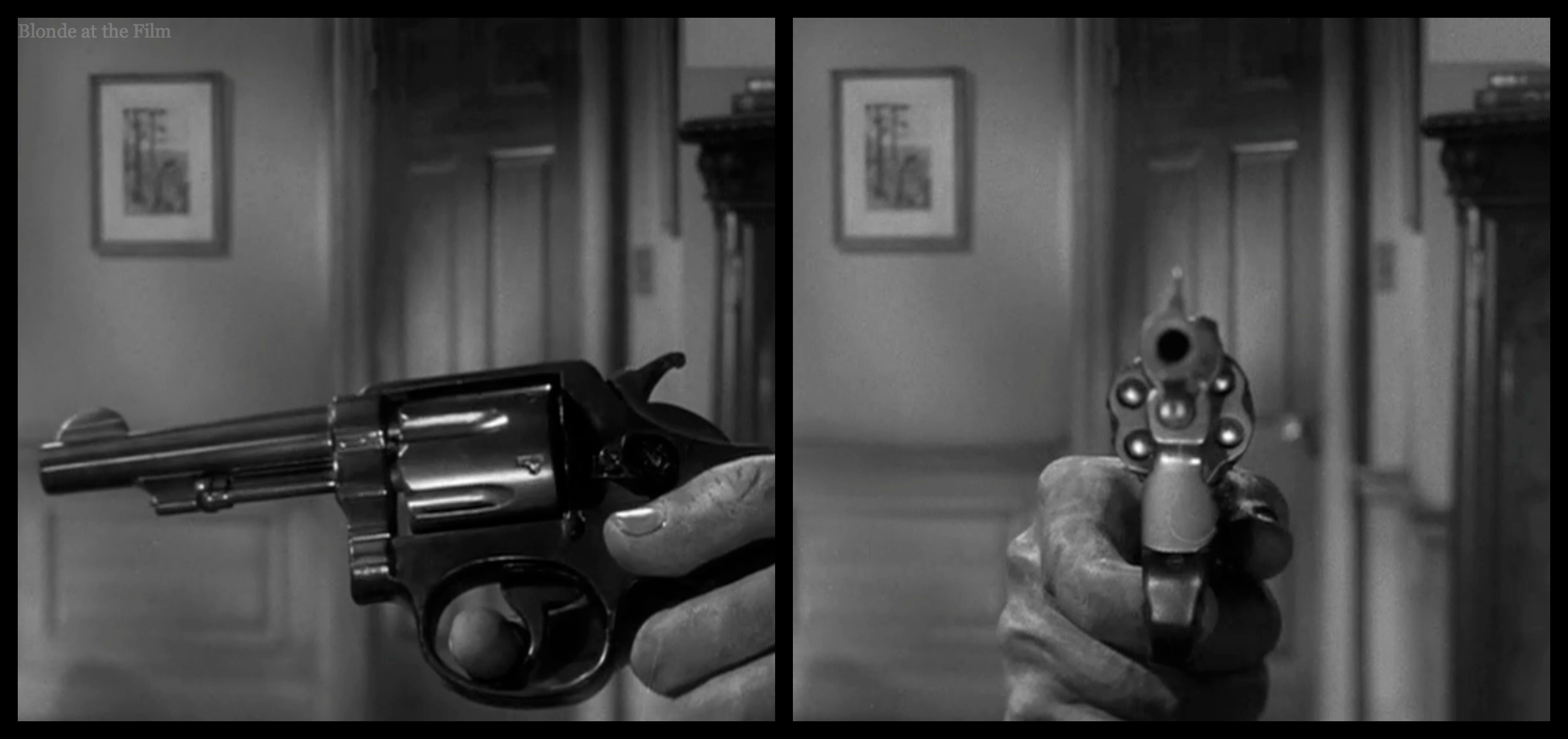 Hitchcock did something similar in Spellbound (1945) when he couldn’t get clean focus on the gun and on Ingrid Bergman in the same frame. So he used a giant gun and a huge fake hand to get the effect that he wanted.