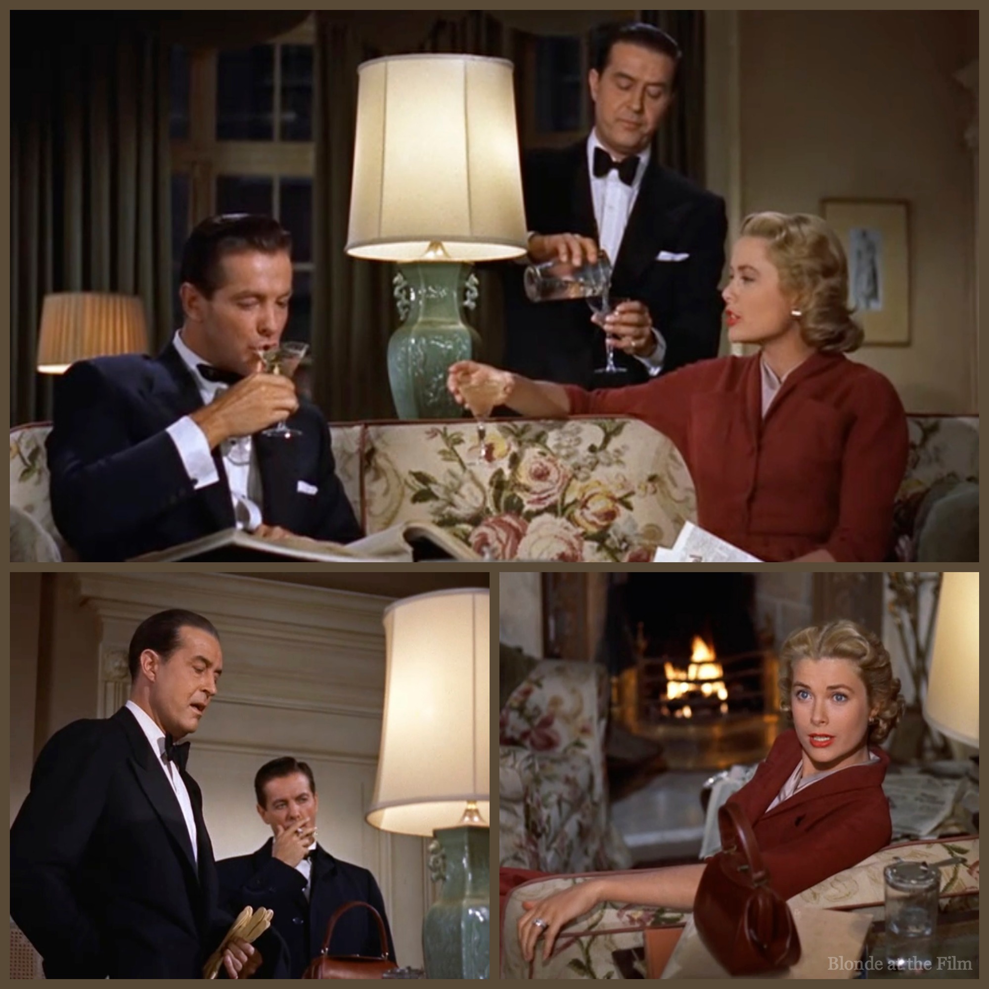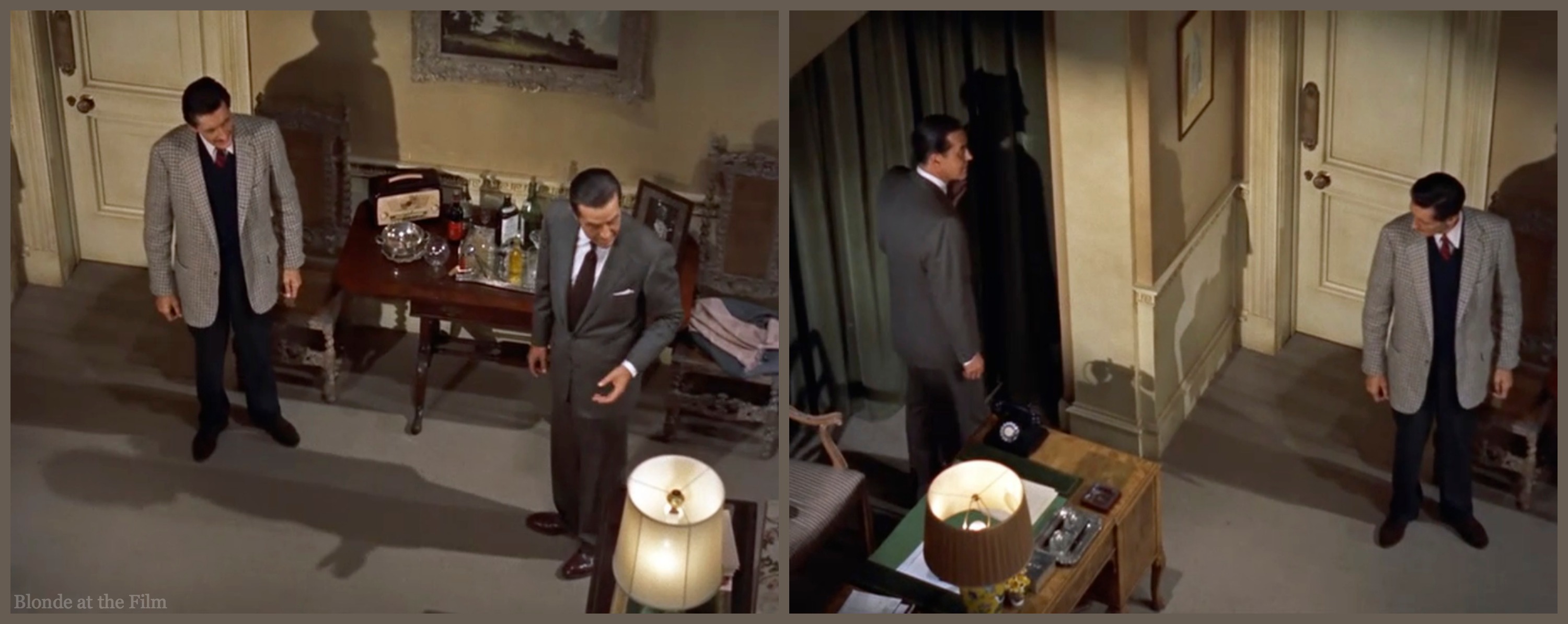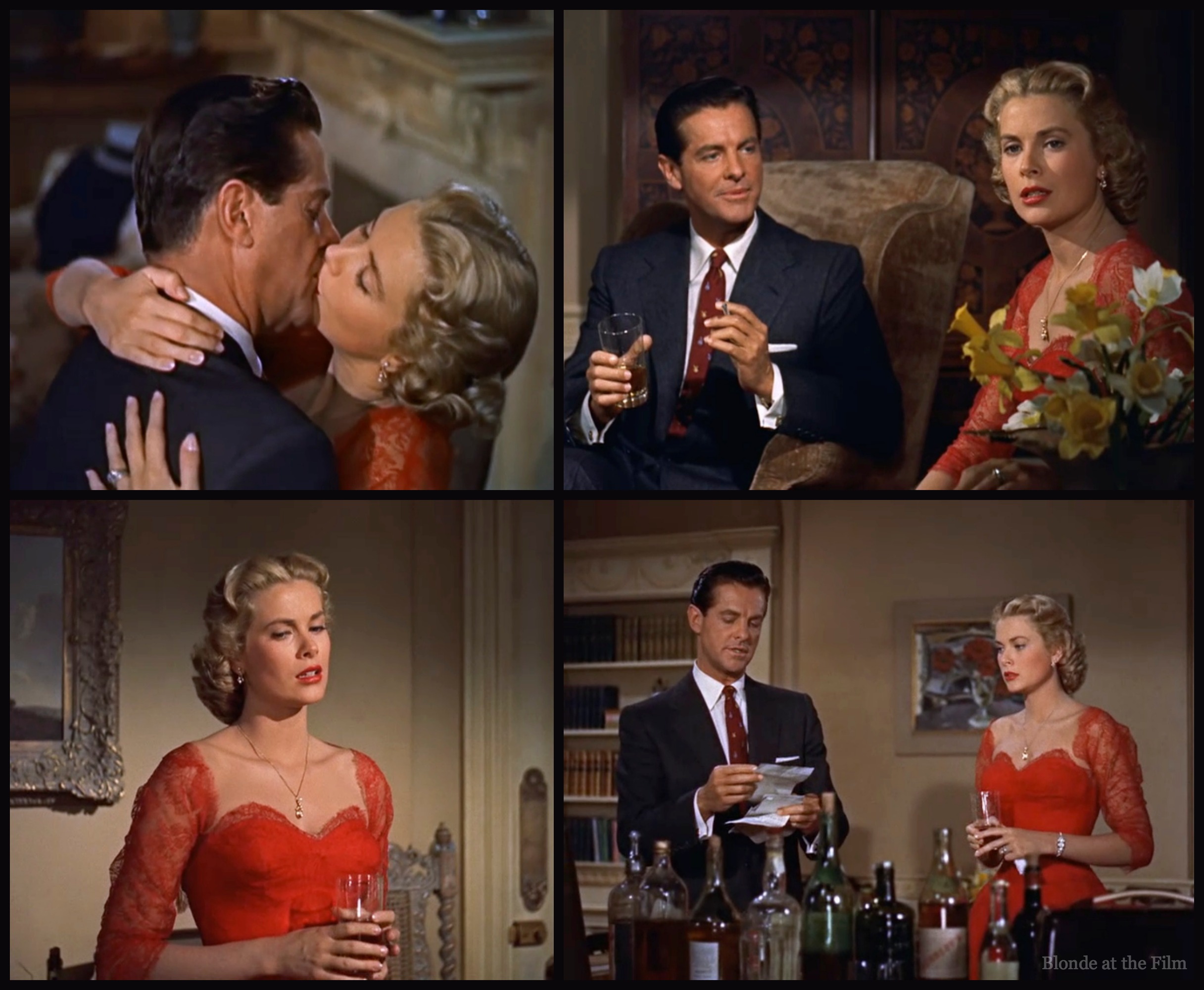 Dial M Cummings Milland Kelly nightThe next evening, Mark and Tony have a drink before going to the party. Notice how Margot’s bright red lace dress of the previous evening has been replaced with a conservative dark burgundy outfit.