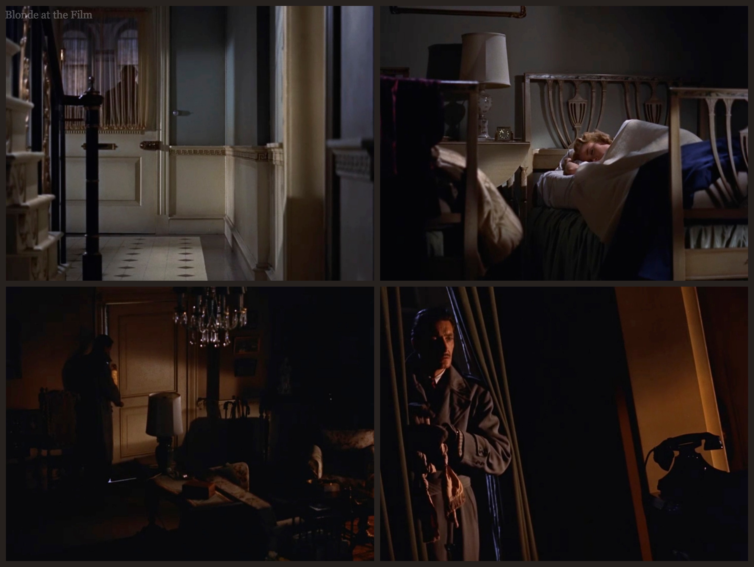 Back to Dial M for Murder, which is actually happening at that very moment in the movie. Sleepy Margot rouses herself from bed and stumbles through the dark living room to the desk. She answers the phone and says, “Hello?” repeatedly, but Tony stays silent. It’s terrifying. We know that Swann is lurking just a few feet away, but Margot has no idea.