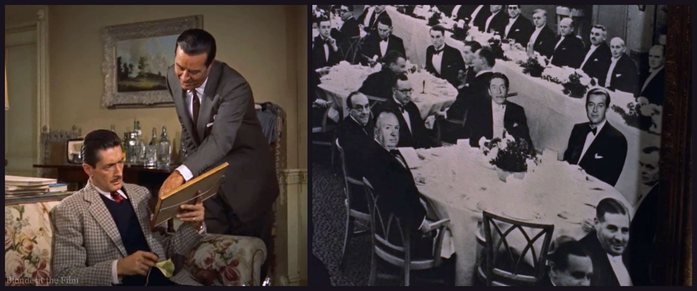 The car-selling gentleman arrives, and what a small world it is! The man, Swann (Anthony Dawson), is one of Tony’s old college pals! Coincidentally, Tony has a photograph from a reunion hanging on the living room wall, and there is Swann with the cigar next to Tony. Fun fact: the man in the left corner of the foreground is none other than Alfred Hitchcock in his customary cameo. Another fun fact: Dawson played the Swann character in the play before reprising his role in the film.
