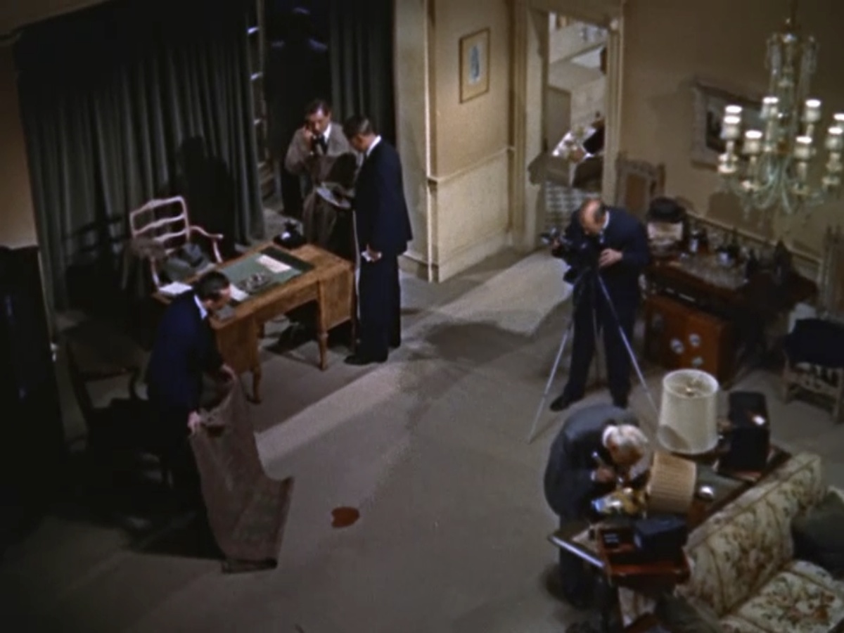 The police arrive, and we watch them work in a high angle shot that rhymes with the murder planning shots of Swann and Tony. It’s nice to shoot the murder preparation and the murder investigation the same way, right? And it’s fun to see the apartment from different angles since we are there for so much of the movie. Clever Hitchcock.