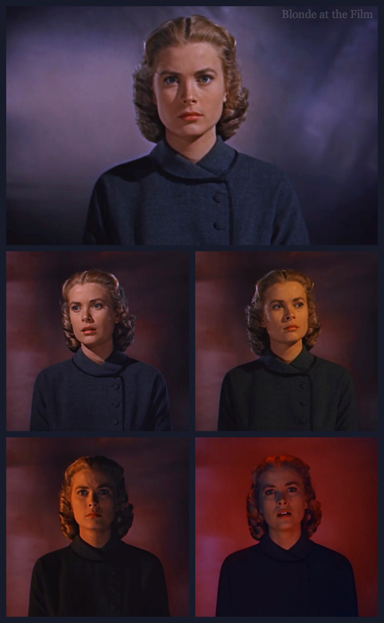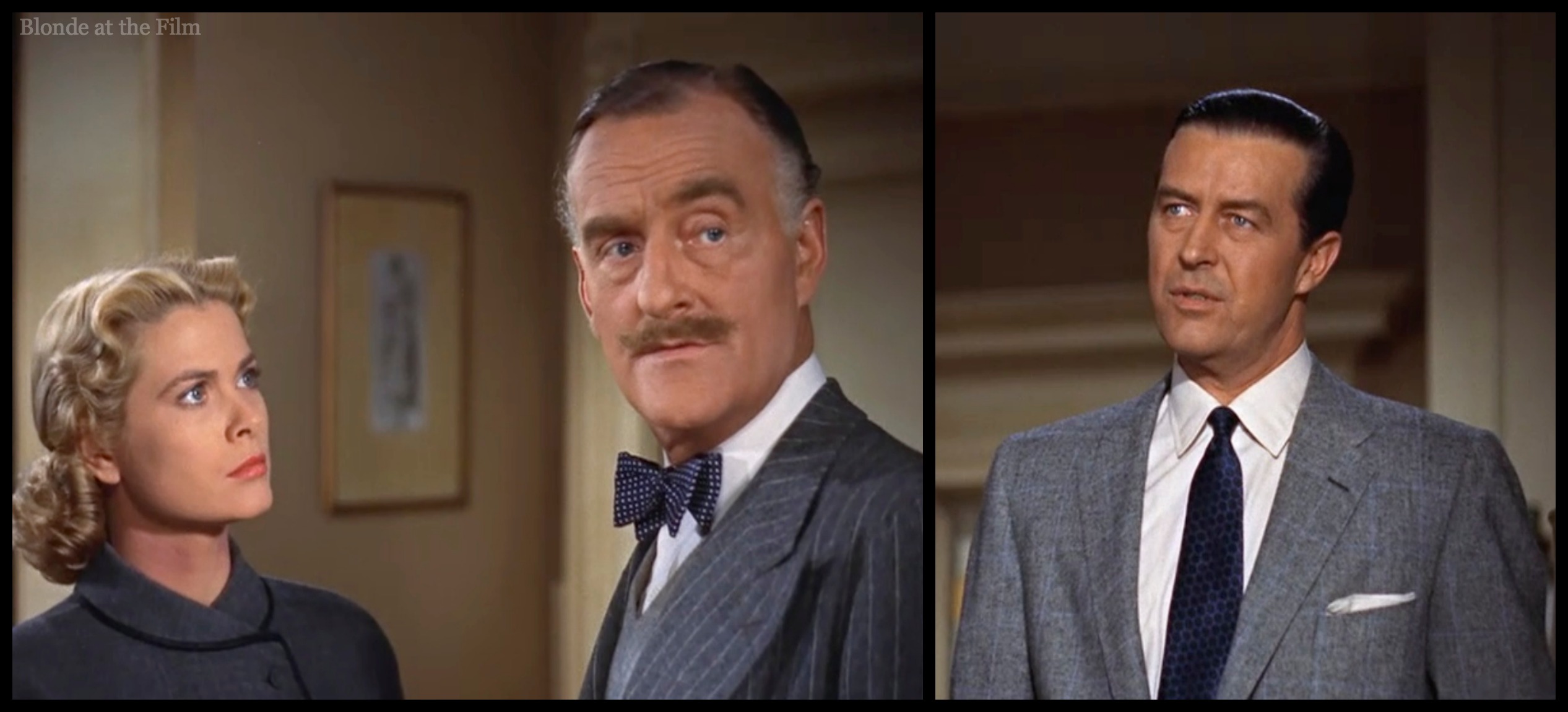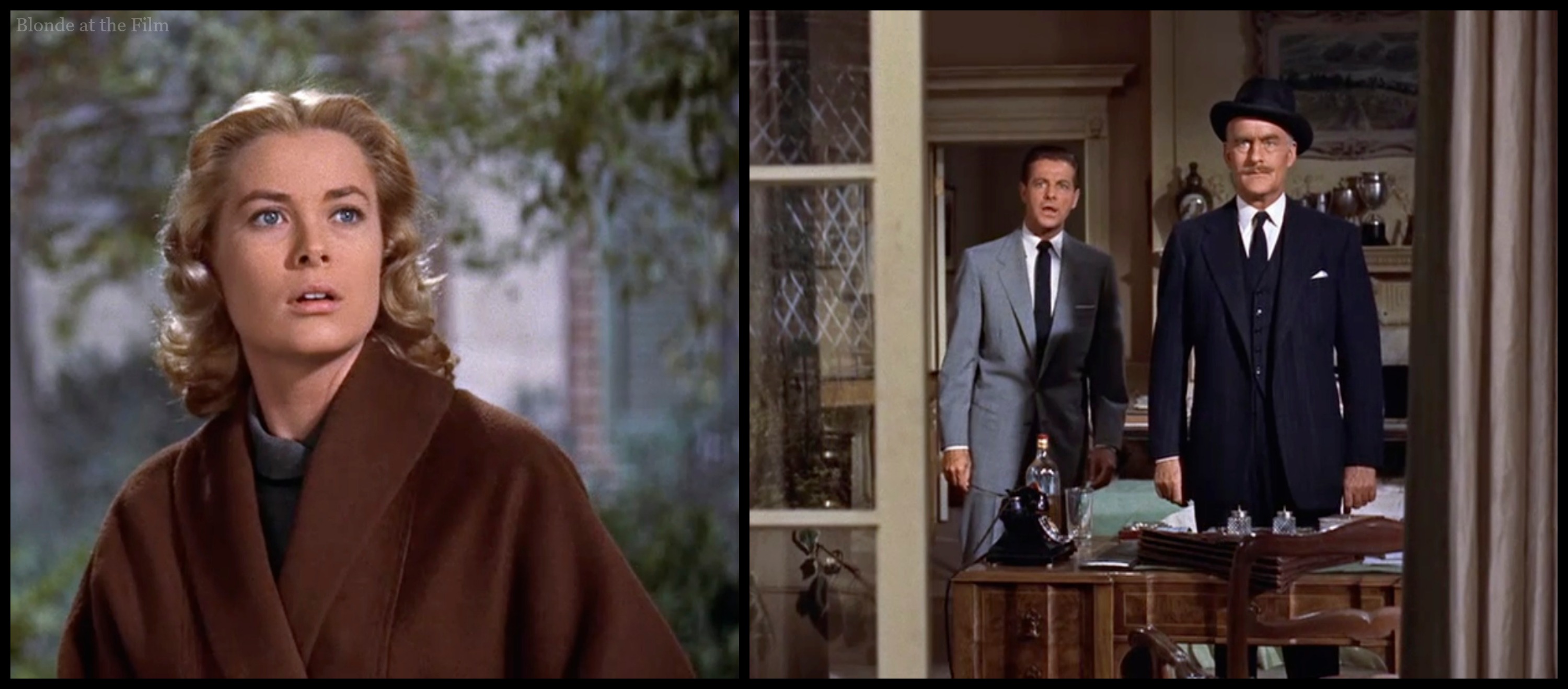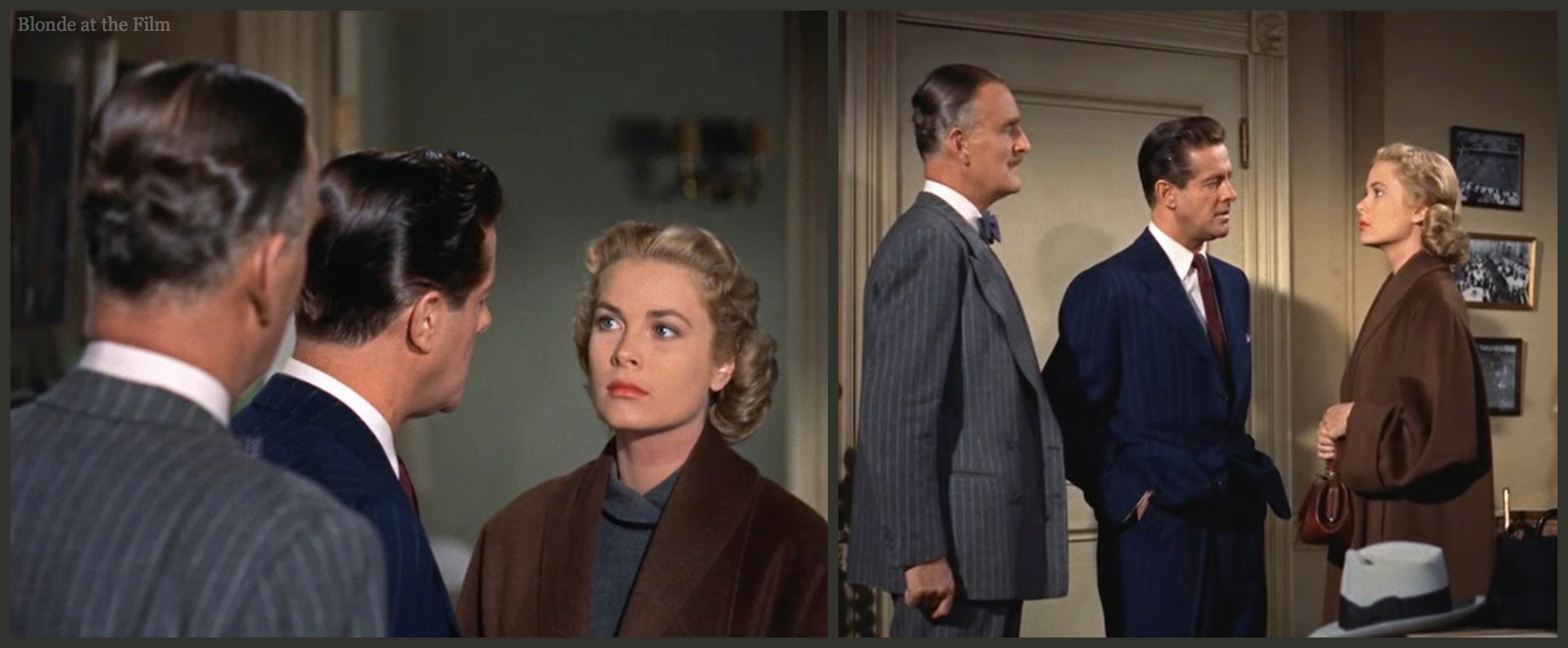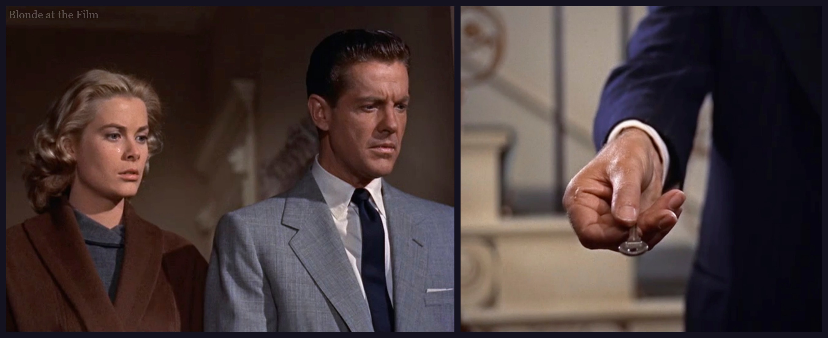 Let’s talk costumes for a minute. To say that Hitchcock was a perfectionist is putting it mildly; he controlled every aspect of his films, including costumes. Hitchcock would forge an excellent, famous working relationship with Paramount’s costume designer Edith Head, with his next films, including To Catch a Thief. (Head designed the costumes for Notorious a decade previously, too). But Kelly’s wardrobe in this film was designed by Warner Bros.’ costume designer Moss Mabry. As usual, Hitchcock was highly involved in the process.