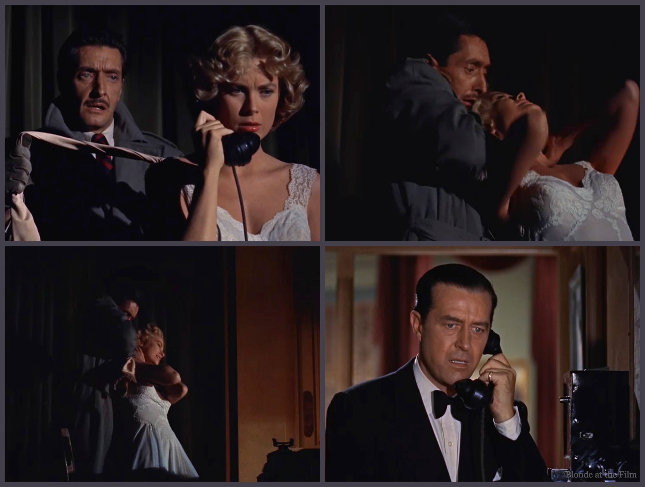 Before we know it, we see Mrs. Wendice in another kiss, but with a different man! Horrors! I’ve juxtaposed both kisses here. It’s cleverly done and rather shocking. Margot seemed like such a nice lady at breakfast in her pale pink robe!