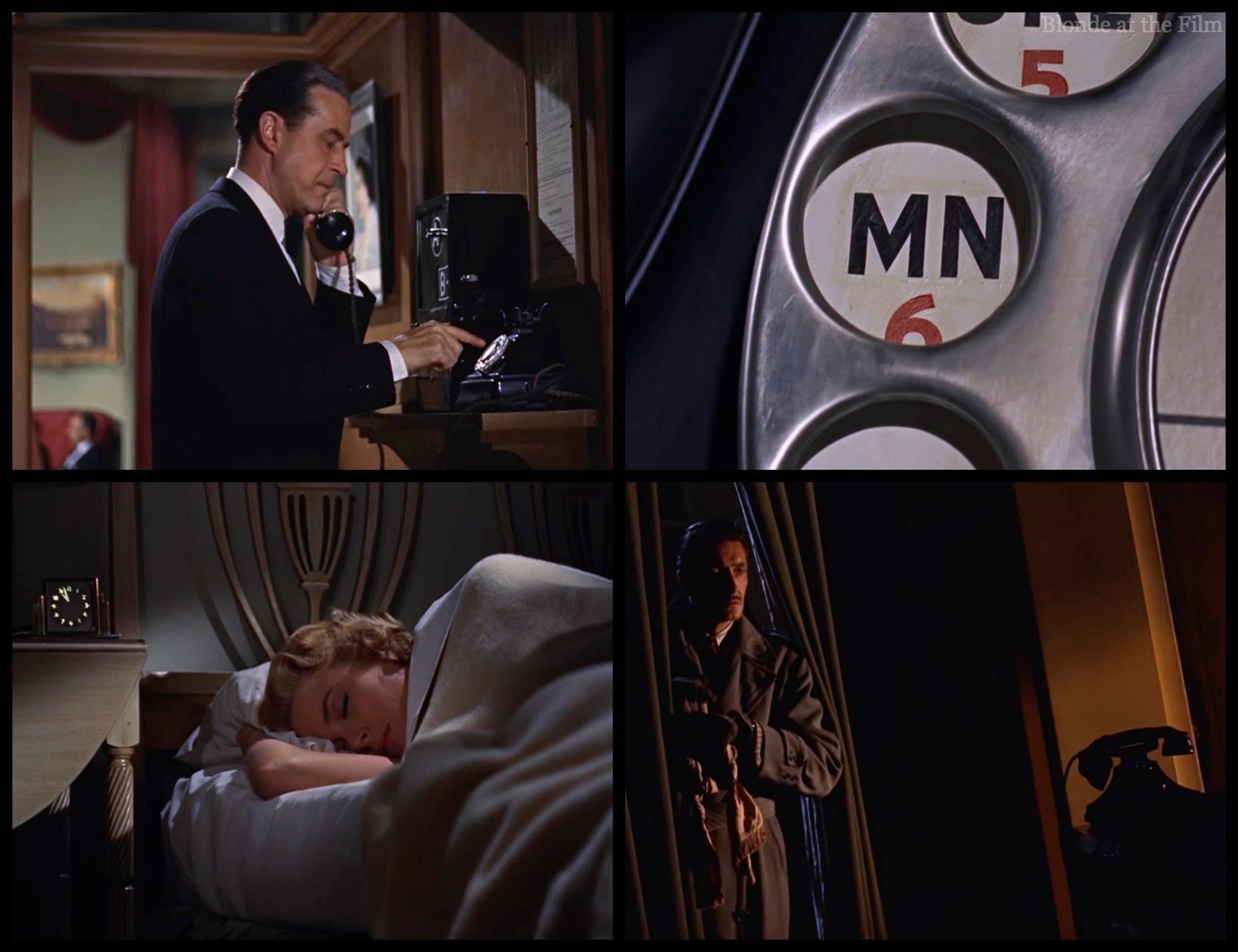 Fun fact: the close-up on the dial is a “fake” because the 3-D camera couldn’t get a crisp extreme close-up like that on an actual phone. So Hitchcock commissioned a giant prop phone and used that for the close-up, instead. He also used a huge fake finger for the actual dialing. The fake finger must have been immense, because look at how big the phone is! The same prop phone was used for the opening title sequence, too.