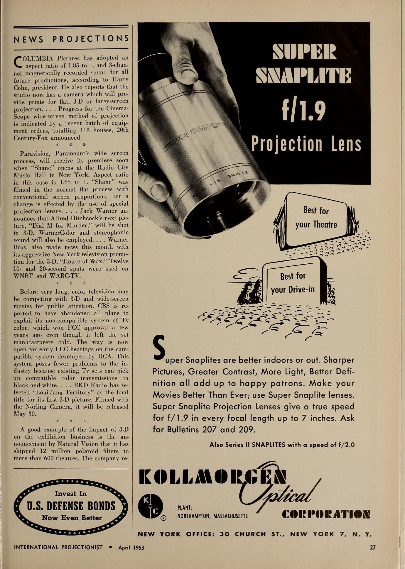 Visit 3-D Film Archive if you’d like to know more about 3-D films in the 1950s, and for a tiny taste of the 3-D and widescreen mania, check out this page from the April 1953 issue of International Projectionist.