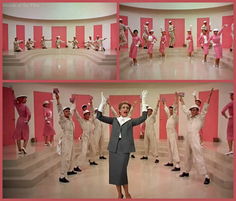 Maggie’s pessimistic appraisal of the substandard issue turns to fevered inspiration when she glimpses that oddly long, pink matchbook. She decides that what the issue and the world needs is pink!  So begins the wonderful “Think Pink” number, part work-place dance, part fashion shoot.