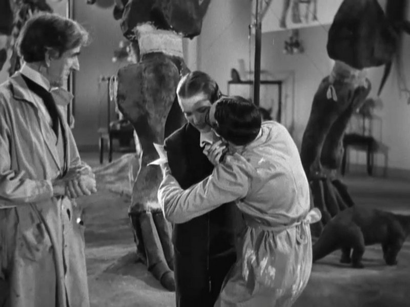 I’m not sure I’d go that far and suggest that the broken fossil symbolizes the physical consummation of their relationship; it is more likely to me that the destruction of the brontosaurus illustrates the end of Miss Swallow and David’s relationship (she did call it their child), and proves that David no longer cares more about his work than anything else. Susan is his priority now, as demonstrated by their embrace after the dinosaur has crashed to the ground.