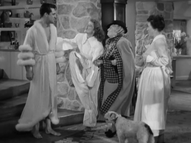 David’s pratfall is the first of many slapstick moments, and Grant especially can hardly stay on his feet in this film. As philosopher Stanley Cavell wrote in Pursuits of Happiness: The Hollywood Comedy of Remarriage (which counts Bringing Up Baby and other screwball comedies among its case studies), these films include “the comic convention according to which the awakening of love causes the male to lapse into trances and to lose control of his body, in particular to be everywhere in danger of falling down or of breaking things.” Normally dignified Grant finds himself in that danger almost constantly in this film.