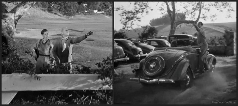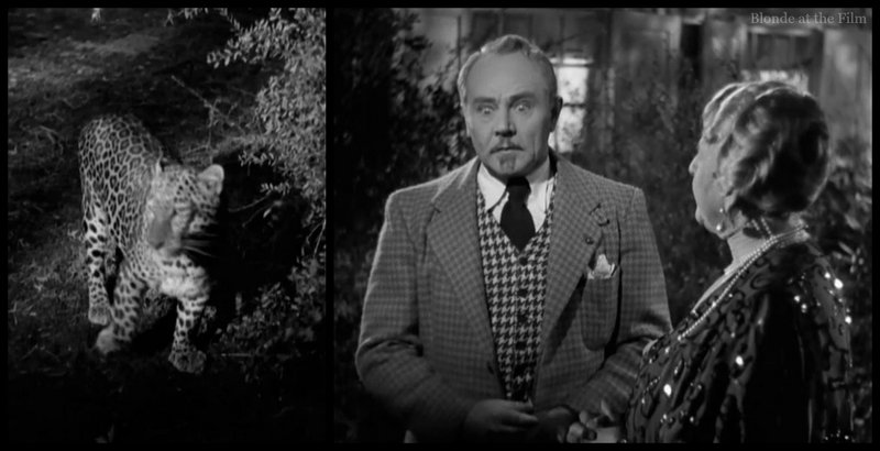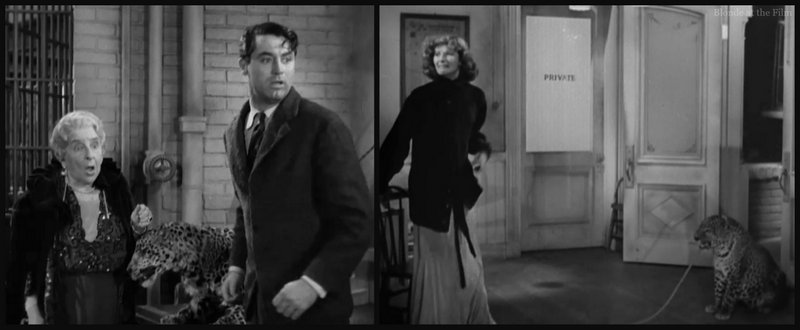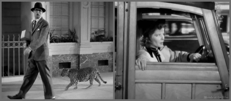 The doubling continues throughout the film: Susan drives away with David riding on the running board twice, she steals two different cars, and the pair end up beneath a bedroom window at two different houses. There are two nearly identical purses, two confused phone calls with Alice, two missed appointments with Mr. Peabody, and of course two leopards! Even Miss Swallow and Susan could be considered doubles. They look alike, though they are the complete opposites in personality.