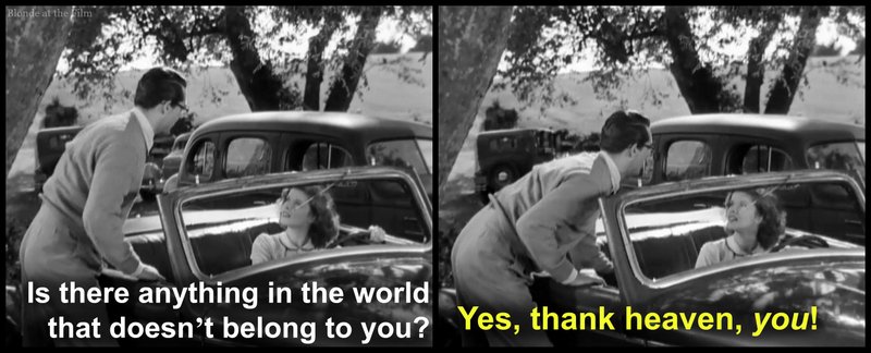 As he gets more and more frustrated trying to make her realize that she is driving his car, she says archly, “Your golf ball? Your car?”