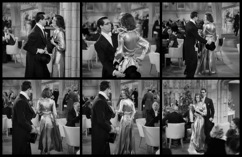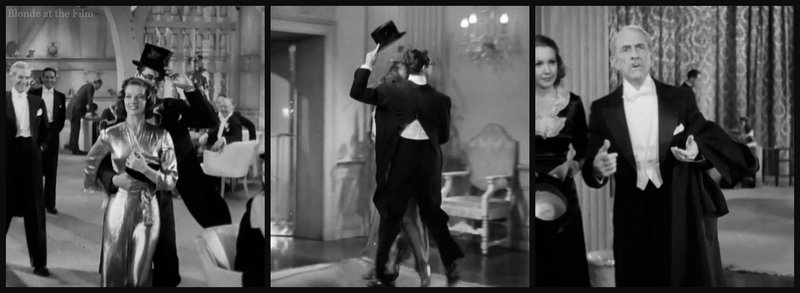 His discomfort is adorably illustrated early in the scene with the hat check girl. She offers to take his top hat, he mumbles and stutters, can’t decide if he should hand it over, and ends up dropping it on the floor. “I dropped my hat,” he says, unnecessarily. Then he bumps heads with the girl as they both bend down to reach for it. As she walks away, hatless, she gives him an odd look.