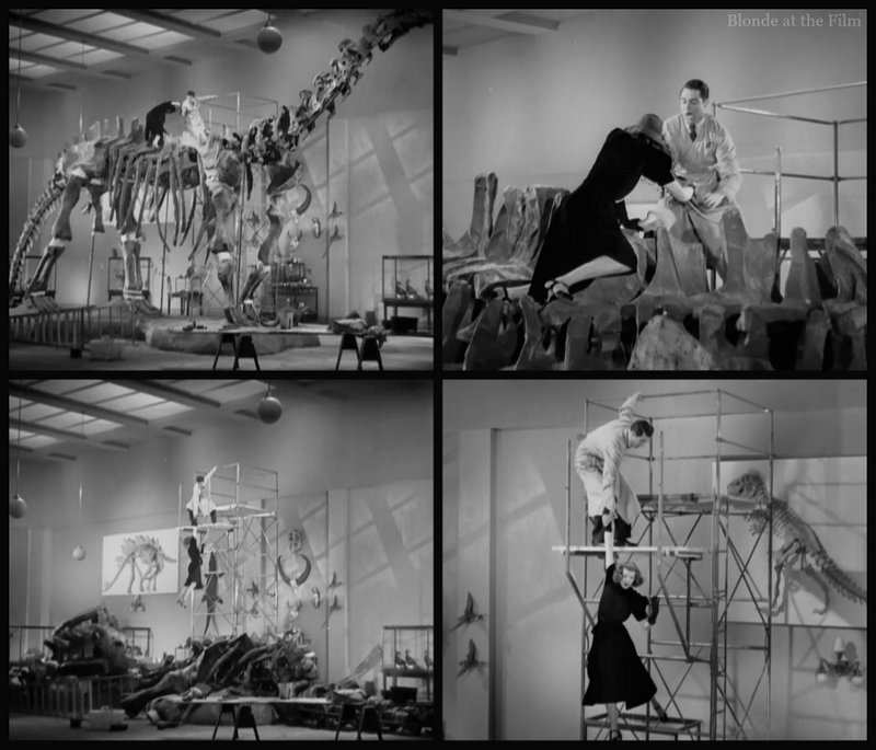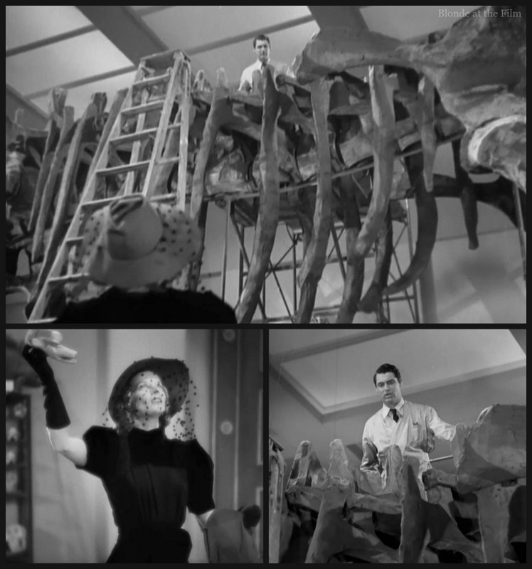 To the film! It opens on the Stuyvesant Museum of Natural History. Nerdy, awkward, absent-minded paleontologist Dr. David Huxley (Cary Grant) perches on scaffolding next to a nearly completed brontosaurus fossil.