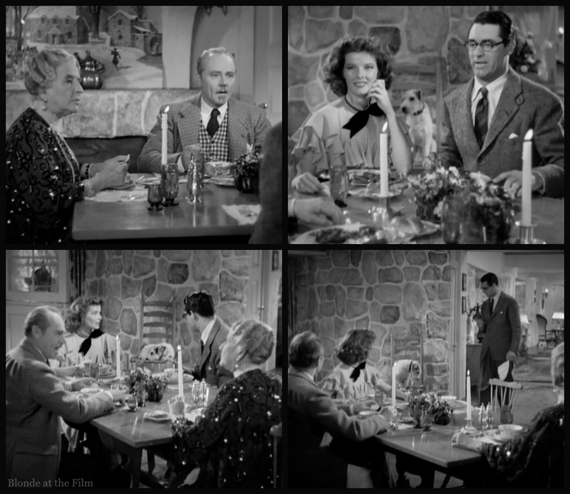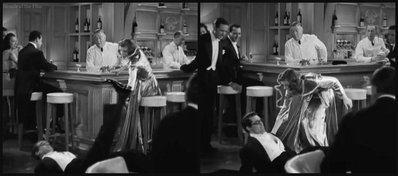 Meanwhile, Dr. Lehman’s wife (Tala Birell) returns from the powder room and realizes that her purse is gone. They start freaking out (it had her diamond pin in it!), and just then David walks by their table holding the purse. Mrs. Lehman thanks him for returning her purse, but when she reaches for it he refuses to give it back. He still thinks it’s Susan’s, you see.
