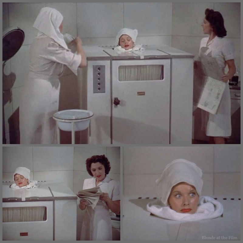 The other time we saw Connie she was in a bathing suit, too, which got me thinking. Esther Williams almost always appears in a bathing suit in her first moments onscreen. This is true of Andy Hardy’s Double Life (1942), Bathing Beauty (1944), Thrill of a Romance (1945), Ziegfeld Follies (1946), On an Island With You (1948), Neptune’s Daughter (1949), Duchess of Idaho (1950), Texas Carnival (1951), Million Dollar Mermaid (1952), Dangerous When Wet (1953), and Easy to Love (1953). It’s not true of A Guy Named Joe (1943) or Skirts Ahoy! (1952), though. Dissertation topic! Not really.