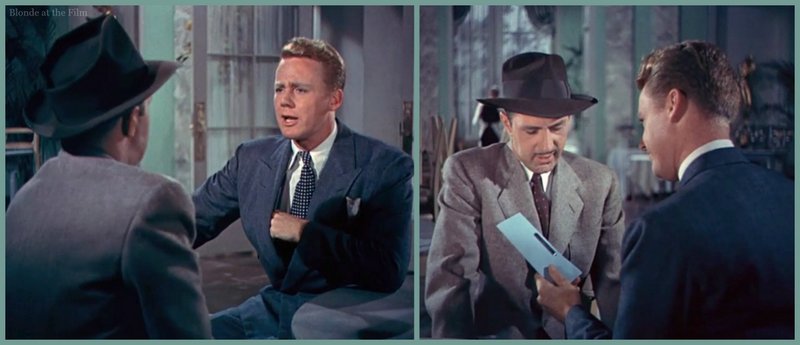 That’s Ben Blue beside Van Johnson. Blue plays Spike Dolan, Warren’ assistant, who is assigned to photograph Connie and Bill in compromising positions as proof of the affair. Blue was a character actor who appeared in small, comedic roles in many films and TV programs from the late 1920s-1970s.