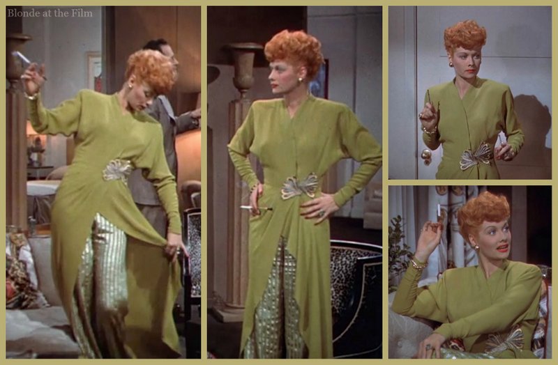 Ball wears the most spectacular costumes in this film. This acid green number with shiny trousers is amazing, and Gladys knows it. She struts and poses around the apartment with her cigarette in a classy holder.