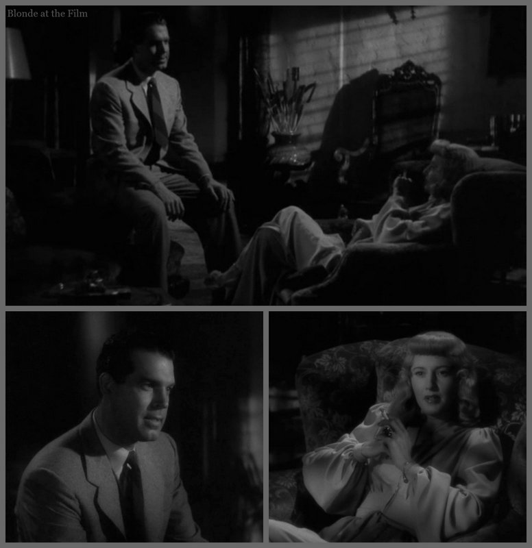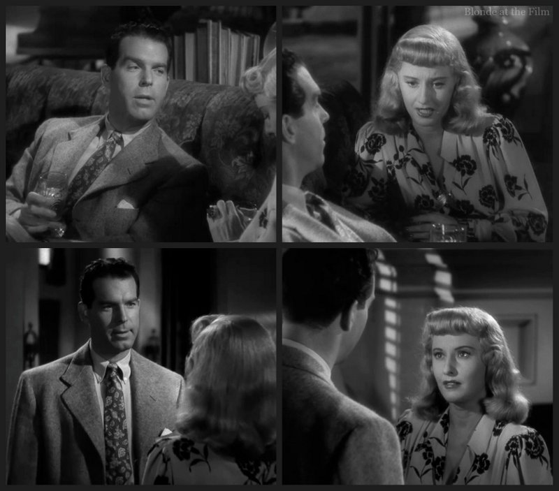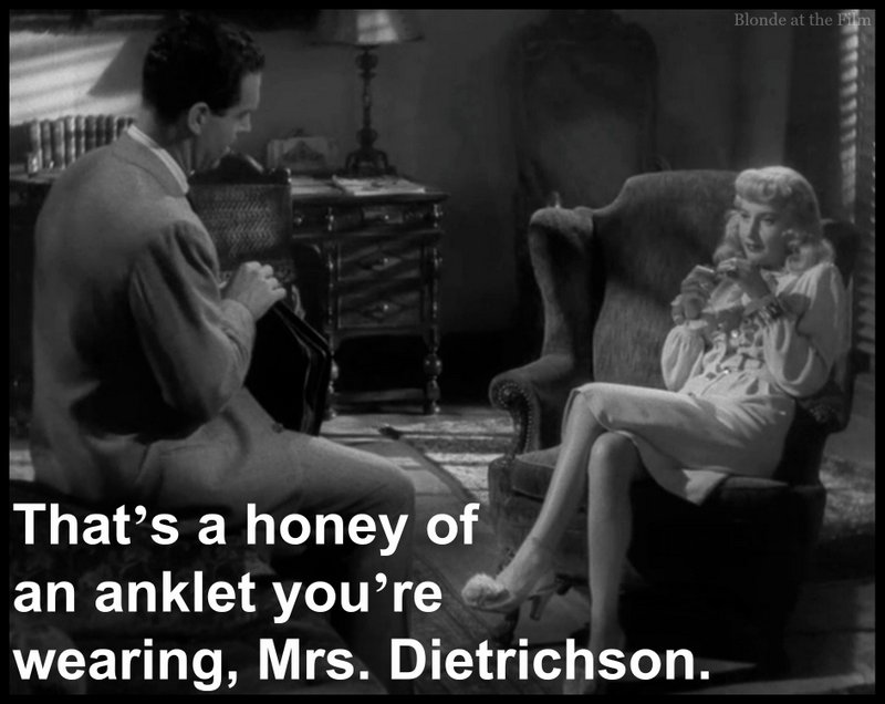 Costume appreciation break. Just a typical afternoon dress for receiving insurance salesman, right? Notice how the waist of the dress dips in the back. Stanwyck had a “figure problem,” a long waist and a low, wide bottom that stumped designers. Until Edith Head came along…
