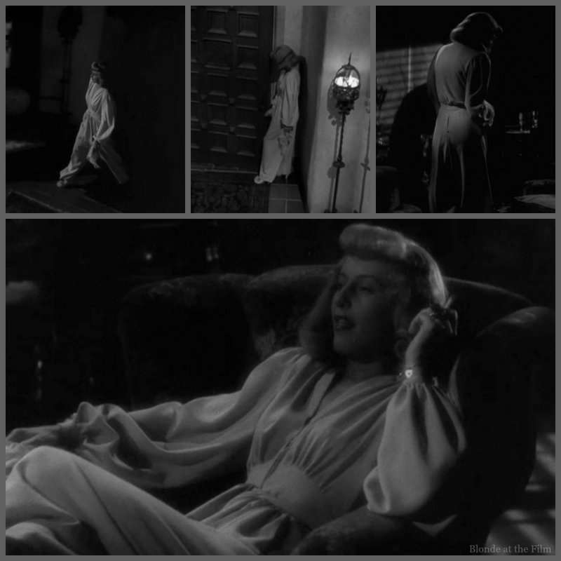 Now for a costume appreciation break and wig discussion. We’ve got to get that out of the way. Stanwyck looks different in this film, mostly because of the brassy blonde wig. It’s an odd, clearly fake hairstyle with heavy sausage curl bangs and a platinum glow.