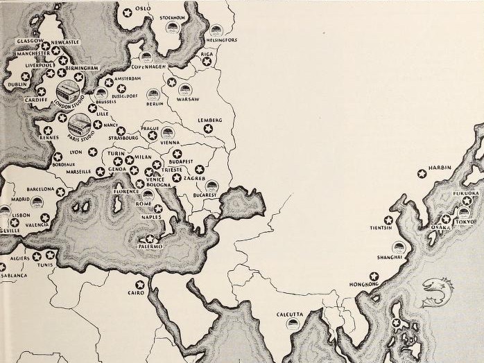 The second option devised to retain foreign audiences was a bit more extreme. The big American studios already had distribution offices and theaters dotting the globe, as you can see from this map of Paramount’s “empire” published in Motion Picture Herald in August, 1931: