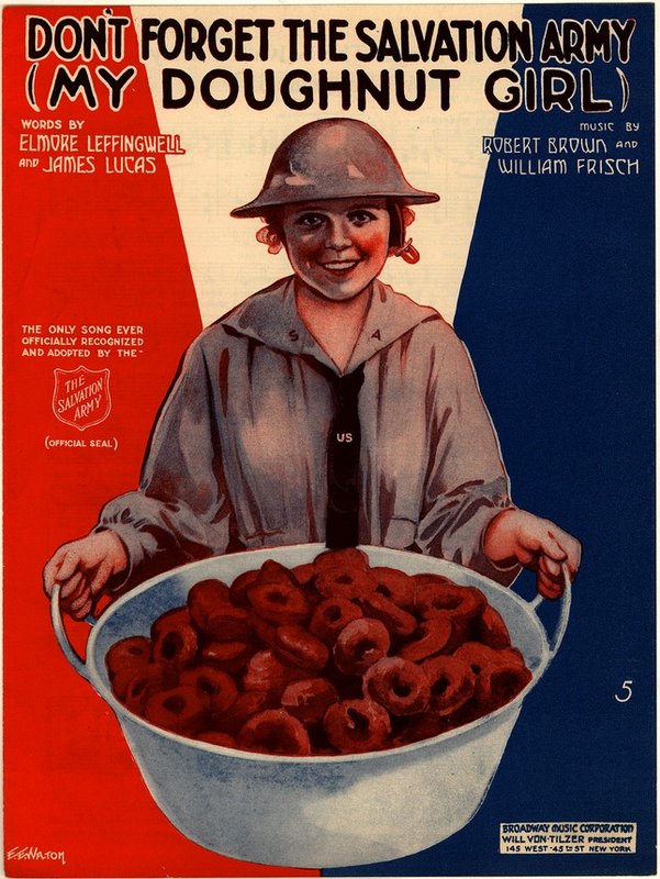 That donut delivery system explains this song, “Don’t Forget the Salvation Army (My Doughnut Girl)” with its charming illustration. With that in mind, one would be forgiven for thinking that the term “doughboy” came from all these doughnuts, but actually that term had been used since the 1840s to describe American soldiers.