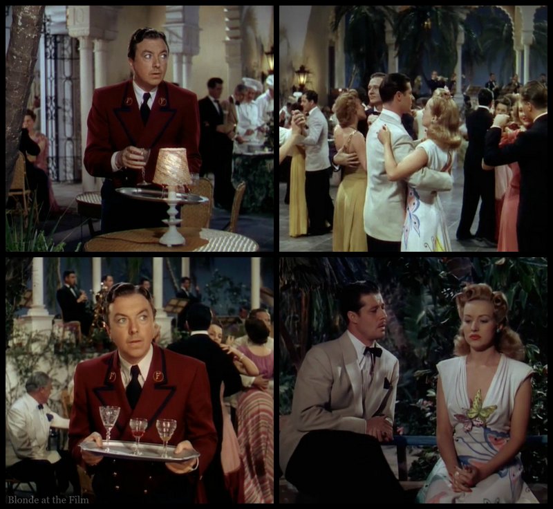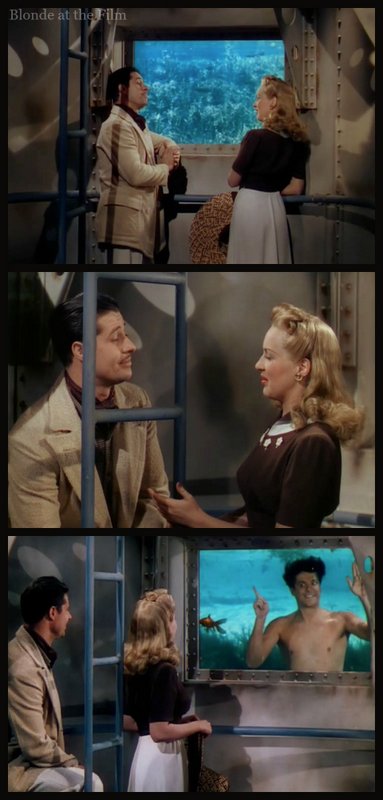 Let’s talk about the Technicolor palette for a minute. You’ll notice that a dusky, greyish blue shows up quite frequently. It’s everywhere in this movie: the ladder and trim in the sub (my favorite inexplicable detail), the walls in the hotel, and Kay’s spangly scarf, which you’ll see in a minute. This color, as well as other highly saturated, rich tones, was a mainstay of 1940s Technicolor design. Some colors photographed better than others (you’ll see a lot of chartreuse, hot pink, emerald green, and pale yellow, too), so there is a definite look to films from this era.