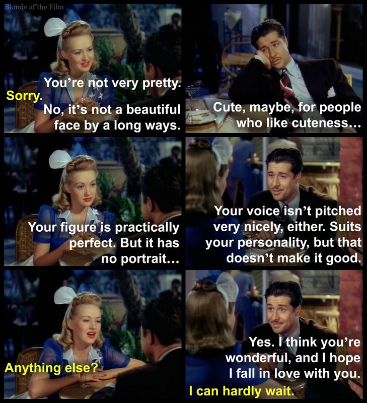 Now isn’t that tidy? And a nice turnabout for “ugly” Barbara to get the millionaire! More importantly, both sisters marry for love, which redeems their nasty gold-digging characters. Thus, Moon Over Miami follows the trajectory of almost every other movie about women looking for rich husbands.