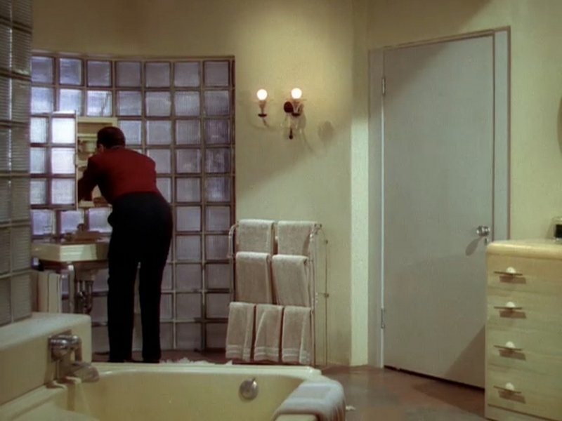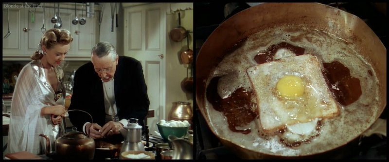 One might assume that Jeff’s father would be suspicious of his son’s fiancee, but he embraces Kay at once and even shows her how to make “gashouse eggs,” or egg-in-a-hole. See if you can find the egg and bread among all the grease: