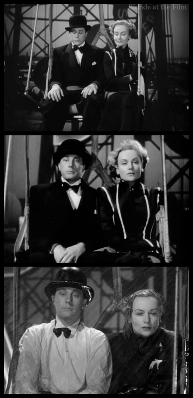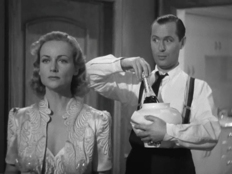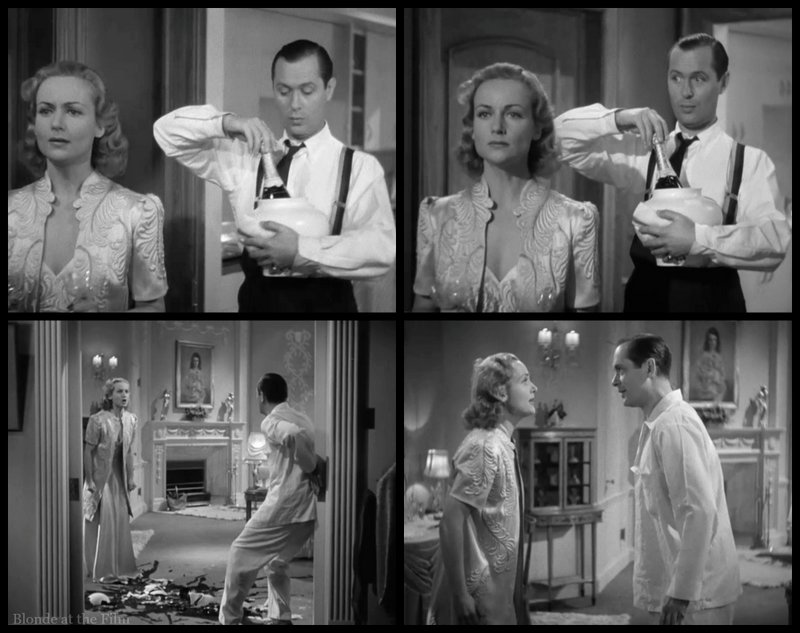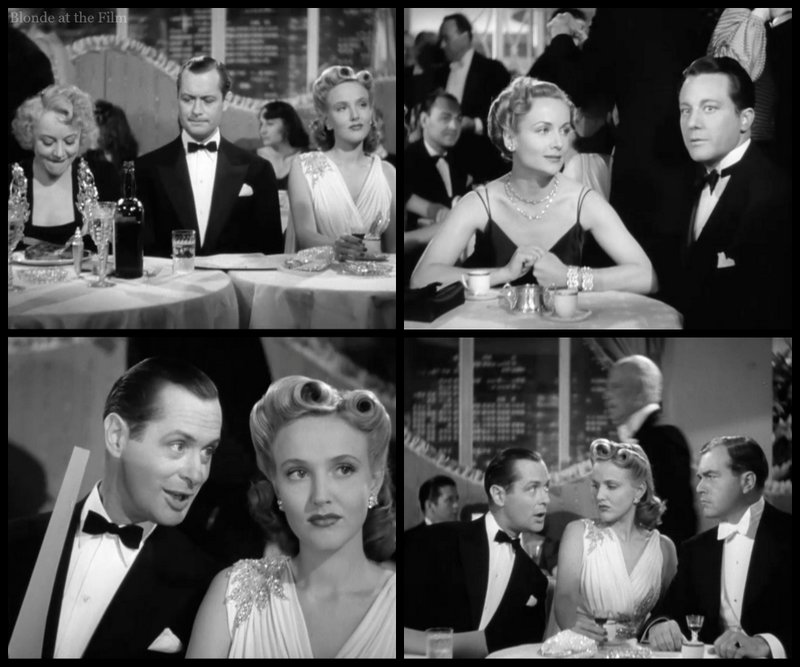 Costume appreciation break. Lombard’s black dress with the scoop back and double straps is stunning, though unfortunately we never get a good look at the two-tiered skirt. The shape of the dress is echoed by her crisp evening coat. Irene (Lentz) designed the costumes for this film. Irene worked at RKO and other studios in the 1930s before going under contract to MGM in 1941.
