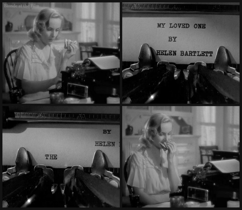 After talking to Ken, Helen starts some work of her own. She’s an aspiring writer, though her short stories and novels have not yet found a willing publisher. I love this scene of Helen munching on a sandwich while she starts her new novel. After typing the title, her name, and “The,” she leans back, apparently stuck.