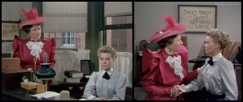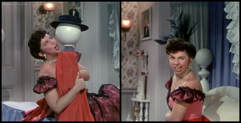 At one point, she pulls out a plain, conservative dress from her trunk and then throws it across the room to emphasize her new, naughty style. The dress she throws is the one that Cyd Charisse wears for her solo with the piano player in The Harvey Girls (1946)!