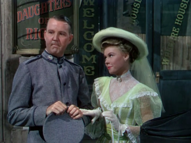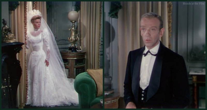 The pastel gowns make for a gorgeous kaleidoscope as Charlie and the ladies dance around the room to the song “Who Wants To Kiss The Bridegroom.” Helen Rose designed the women’s costumes for this film, and Gile Steel was in charge of the men’s. As is typical of classic Hollywood’s take on period films, both genders are clad in 1950’s fashions with only slight 1900’s tweaks. Everything is more daring, more colorful, less pigeon-silhouetted, and much more sparkly than true turn-of-the-century fashions.
