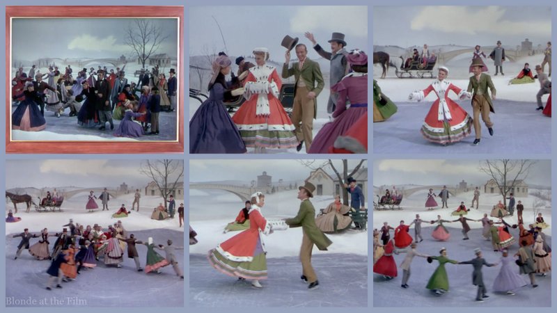 Next up is winter. We’ve apparently gone several decades back in time, too, judging from the hoop skirts. Fun fact: according to IMDB, you can see the refrigerant pipes used to freeze the “pond” water in several shots. Also, they dyed the water to make it look better in Technicolor!