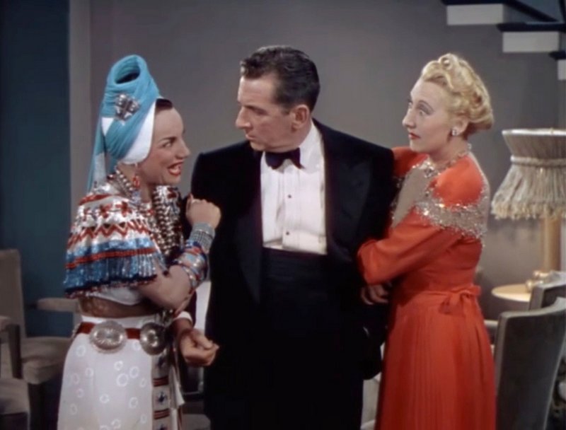 Carmen Miranda, who is not a bowl of fruit, is confusing Brazilian folk songs with “Chattanooga Choo-Choo”; Betty Grable is tossing a tidy torso in lieu of other abilities; Cesar Romero galumphs through a couple of dance routines with a grace that Arthur Murray would hardly approve, and Charlotte Greenwood, that ineffable grotesque, thrusts her gangling legs in all directions. Check John Payne and Edward Everett Horton as also present. In short, it is just the party one would expect in this Technicolored moonshine.