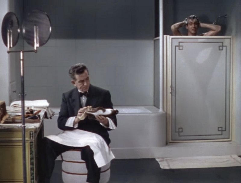 Dan (John Payne) enters the theater and finds a preemptively furious Vicky waiting for him. He smells of perfume, and it’s a scent she recognizes. Indeed, in an amusing exchange before Dan arrived, Vicky explained to Phoebe that she would know which girl Dan had been out with depending on what perfume clings to him.