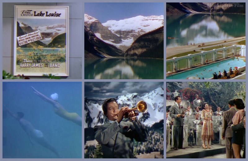 Although the rest of the movie takes place at Lake Louise, it wasn’t actually filmed there. But it was supposed to be; at least, the Hollywood Reporter wrote that Fox planned to shoot on location because of “defense regulations hindering exterior shooting in the Hollywood area.” But in the end, only B-unit footage, like the kind in the collage above of the lake and pool, was filmed at Lake Louise. Grable and the other actors didn’t travel to Canada, which explains some of the interior-focus of the movie. But most Hollywood films weren’t shot on location; the scenes in Duchess of Idaho and Moon Over Miami were “faked,” for example, but Springtime doesn’t even try.