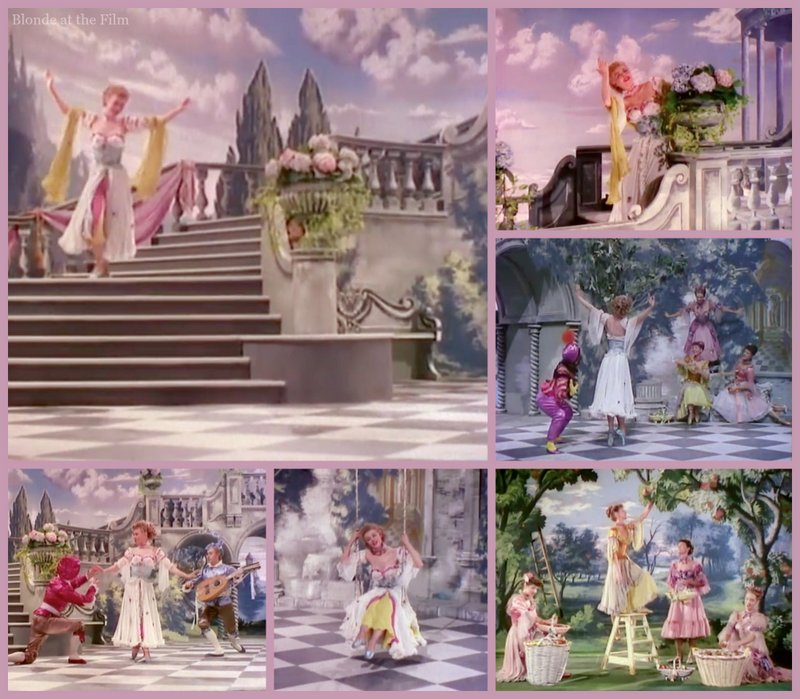 Meanwhile, Janet rehearses a new pastel number. Vera-Ellen was an accomplished dancer who had trained as a ballerina, so often she will dance en pointe as she does in this scene. Fun fact: IMDB claims that the look of this number was inspired by Jean-Honoré Fragonard’s 18th century rococo paintings. You may recognize him from the famous work “The Swing.” Ellen has a swing, too!
