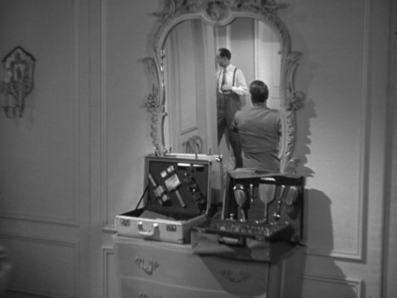 As they prepare to leave, a bellboy snoops in their bedroom and sees their silver toiletry sets. He mumbles to himself about this great score, not realizing that Nick watches him from the bathroom.