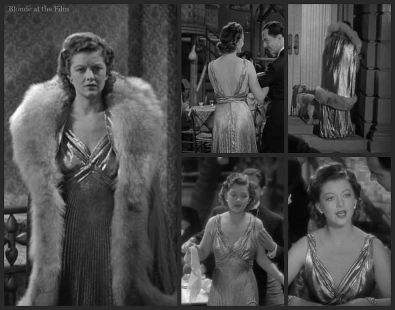 This fur trimmed coat and V-neck, pleated lamé gown remind me of other “Nora” costumes. She often appears in fur and practically backless dresses! In fact, I wonder if the fur trim from the cape-coat in After the Thin Man was repurposed for the lamé coat in this movie.